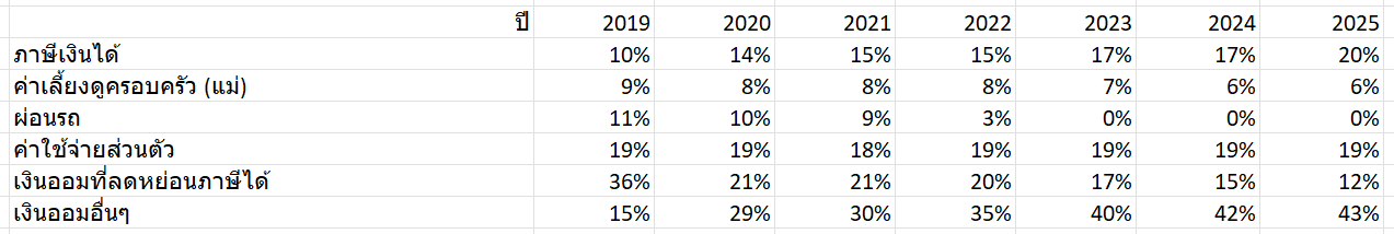 สิ่งที่เติบโตเร็วที่สุดใน 7 ปีคือ ภาษี การขึ้นอย่างต่อเนื่องไม่ได้แปลว่าบริหารแย่ แต่สะท้อนว่า รายได้เติบโตจนเข้าฐานภาษีที่สูงขึ้น ขณะเดียวกัน เงินออมแบบลดหย่อน ที่เคยช่วยดึงฐานภาษีลง กลับลดลง (เช่นปีที่ยกเลิก LTF) ทำให้ภาระภาษีเด่นชัดขึ้นเรื่อยๆ