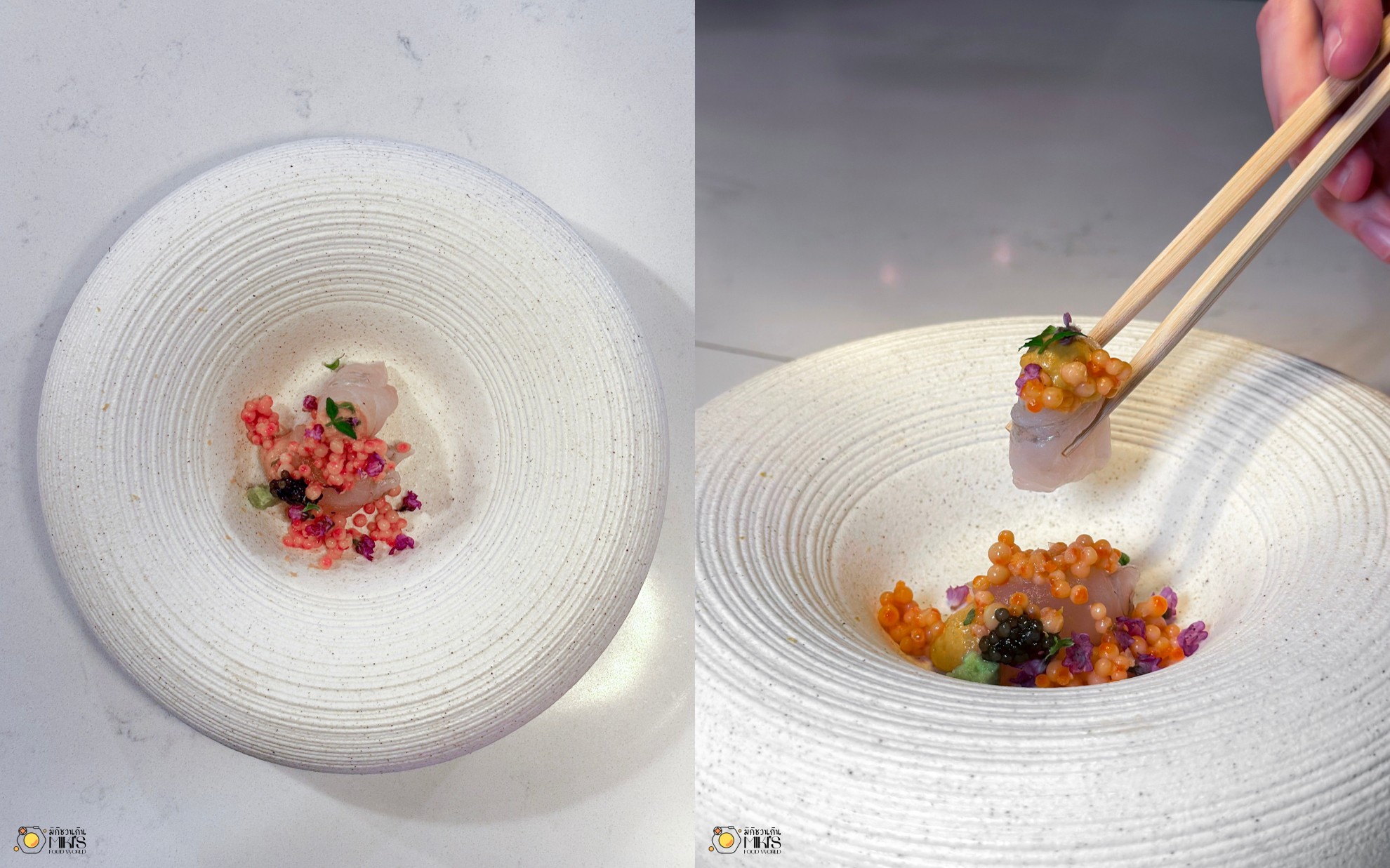 Hirame ปลาตาเดียวเนื้อขาวจากฮอกไกโด แล่บางหนึบหนับ ท็อปด้วยยูซุ อิคุระ และ คาเวียร์จากฝรั่งเศส ทานกับโชยุเข้มข้น รสชาตินัวสุดๆ