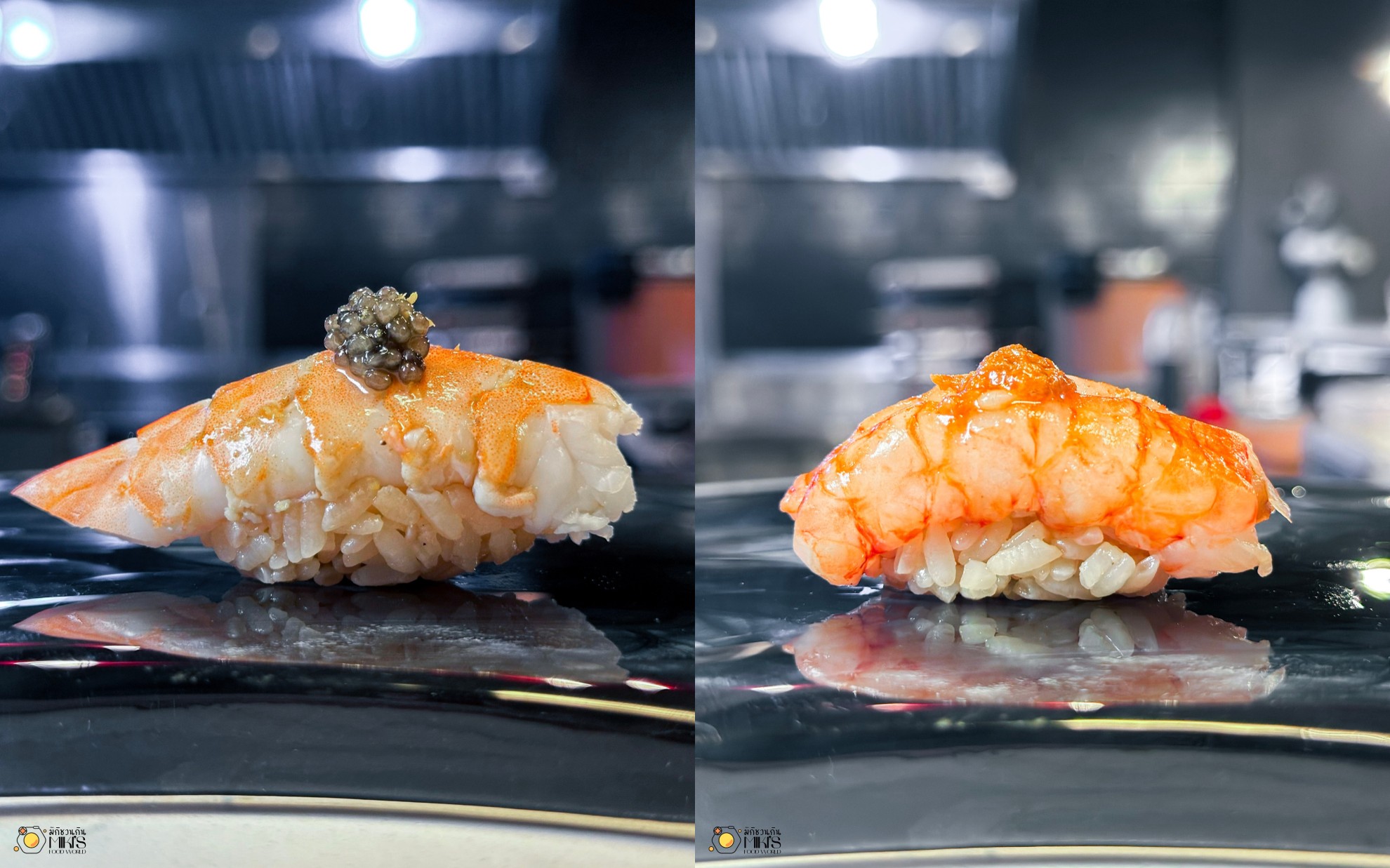 Aka Ebi กุ้งหวานเนื้อเด้ง ท็อปด้วยมันกุ้งรสเข้มข้น เชฟบีบมะนาวตัดรสเล็กน้อย ยิ่งขับความหวานของกุ้งให้เด่นขึ้นมา