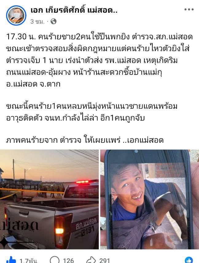 อ.แม่สอด จ.ตาก คนร้ายชาวพม่าใช้อาวุธปืนยิงตำรวจบาดเจ็บ 1 นาย ขณะนี้กำลังหลบหนีพร้อมอาวุธปืน