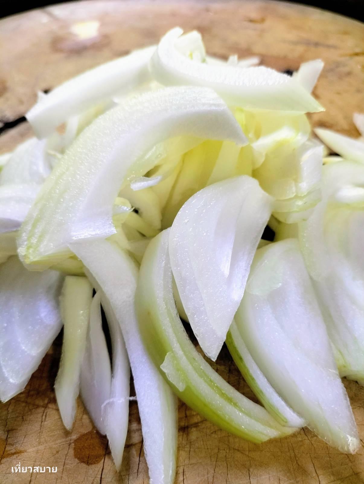 ใส่หอมใหญ่ลงไปผัดจนเริ่มนิ่ม
