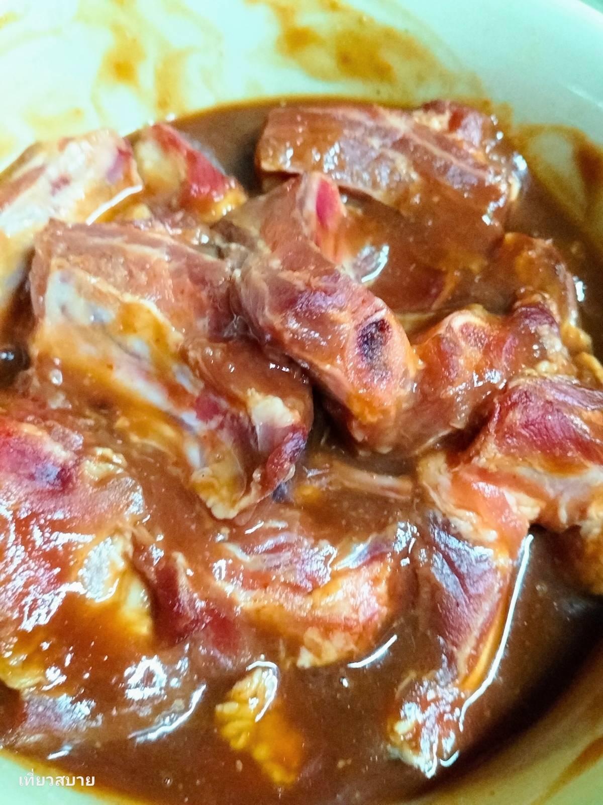 1. ซี่โครงหมู ล้างให้สะอาดหมักด้วยซอสมะเขือเทศ ซอสพริกน้ำมันหอย ซีอิ๊วขาว และน้ำตาลทรายเล็กน้อย นำไปแช่ตู้เย็น หมักทิ้งไว้ 1-2 ชั่วโมง หรือข้ามคืนได้ยิ่งดี เพื่อให้รสชาติซึมเข้าเนื้อ และซี่โครงหมูจะนุ่ม และเปื่อยง่ายค่ะ
