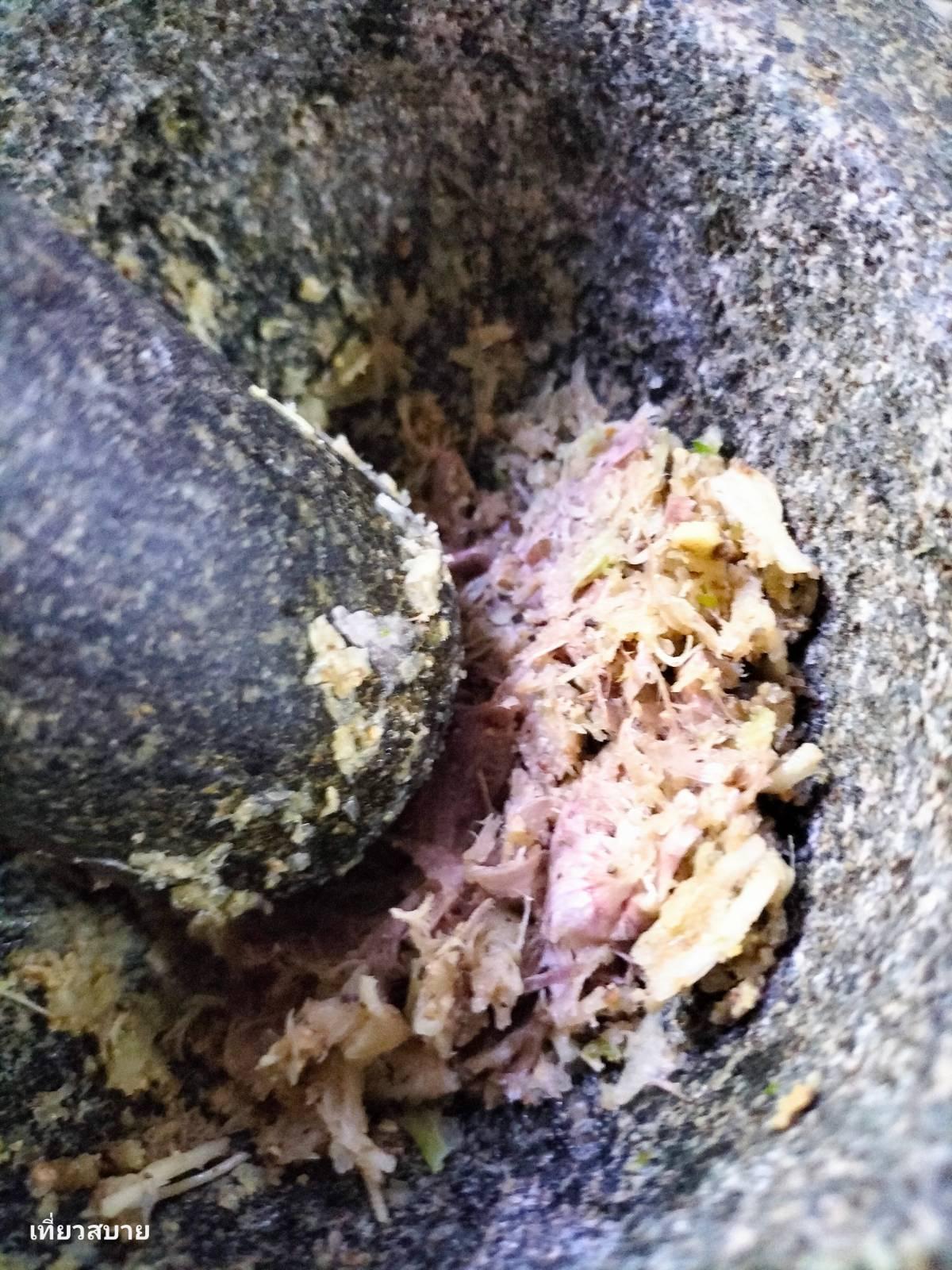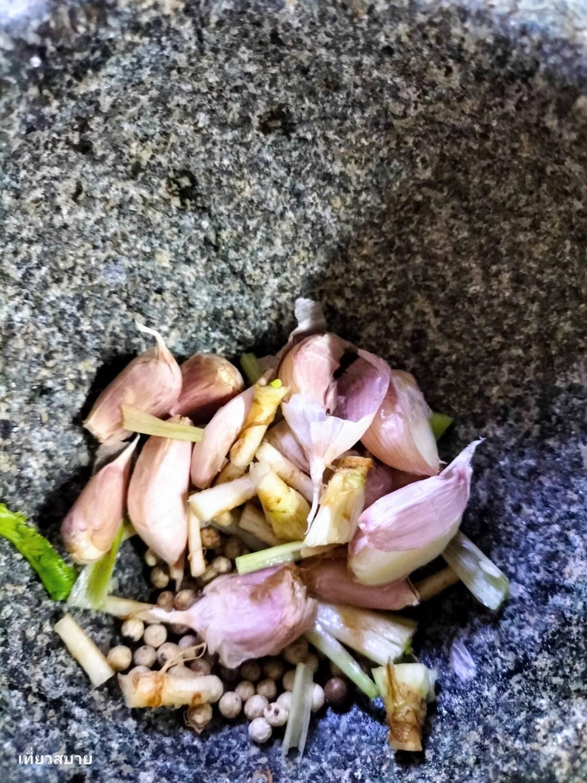 2. ตำสามเกลอกันเลยค่ะ กระเทียม รากผักชี พริกไทยเม็ด ตำให้ละเอียด