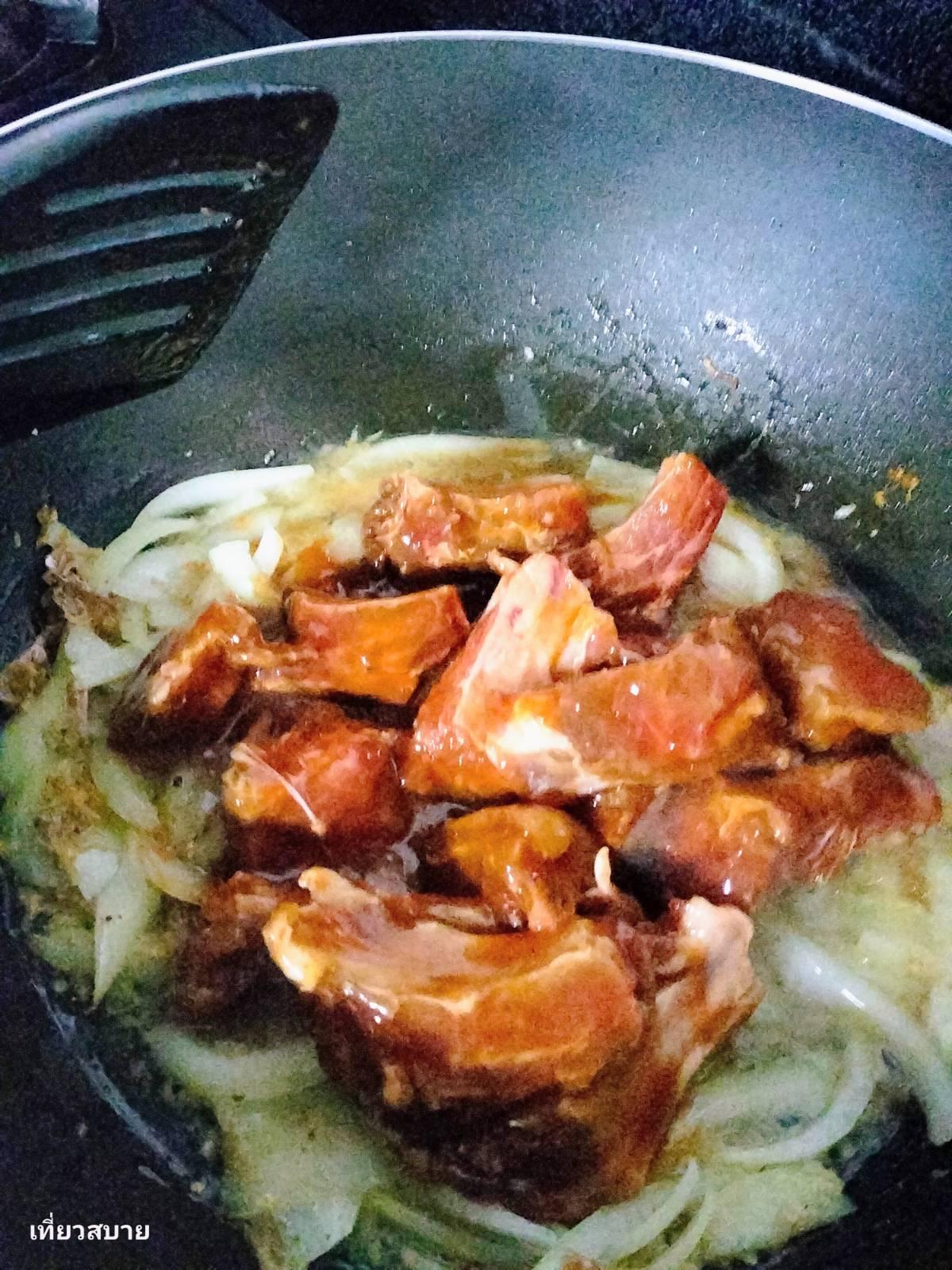 4.ใส่ซี่โครงหมูที่หมักไว้ลงไป ผัดให้ซอสเคลือบเนื้อหมูดี ๆ แล้วจึงค่อยๆเติมน้ำ