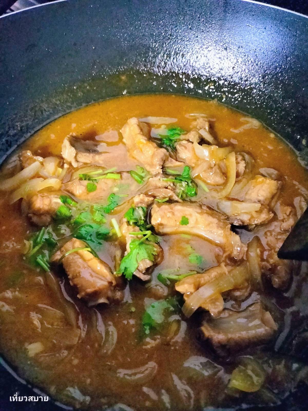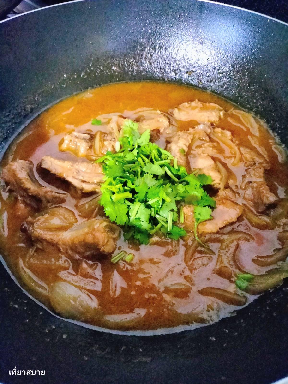 5. ลดไฟลง ใช้ไฟอ่อน เคี่ยวไปเรื่อย ๆ แบบไม่รีบ เปิดฝาดูเป็นระยะ จนน้ำเริ่มงวด หมูเริ่มเปื่อย ปรุงรส ชิมให้ได้ตามชอบ แล้วใส่น้ำมันงานิดเดียว โรยหน้าด้วยผักชี ก่อนปิดไฟ