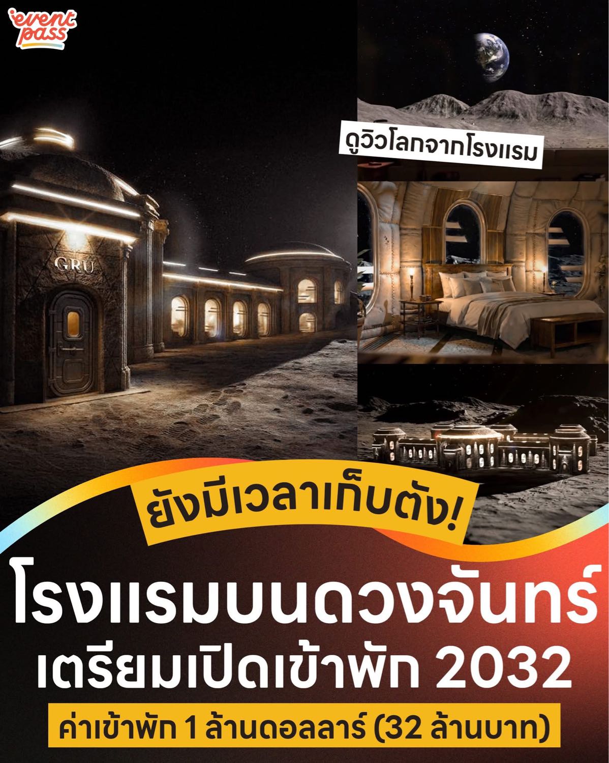 เปิดให้จองเข้าพักแล้ว โดยมีกำหนดเริ่มก่อสร้างในปี 2029 และคาดว่าจะเปิดให้บริการได้ภายในปี 2032 บอกเลยว่าได้ชมวิวโลกทั้งใบ ได้นอนค้างบนดวงจันทร์ มีกิจกรรมให้ทำการเดินบนพื้นดวงจันทร์ การขับรถ การตีกอล์ฟ 👀 ใครสนใจเก็บเงินรอได้โลด ค่าเข้าพักต่อห้อง 4 คน อยู่ที่ 1 ล้านดอลลาร์สหรัฐ (ราว 32 ล้านบาท)