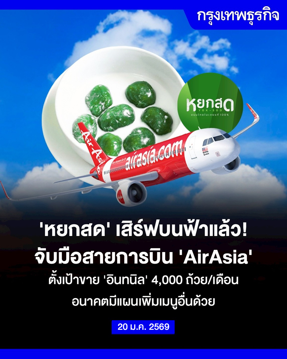 พาขนมไทยใบเตยออกนอกประเทศ! “หยกสด” เตรียมเสิร์ฟบนฟ้าเป็นครั้งแรก จับมือ “AirAsia” ส่ง “อินทนิล” เมนูขายดีตลอดกาลเป็นอย่างแรก ตั้งเป้าขายได้ 3,000-4,000 ถ้วยต่อเดือน ระยะยาวมีแผนเพิ่มเมนูอื่นๆ ขายด้วย