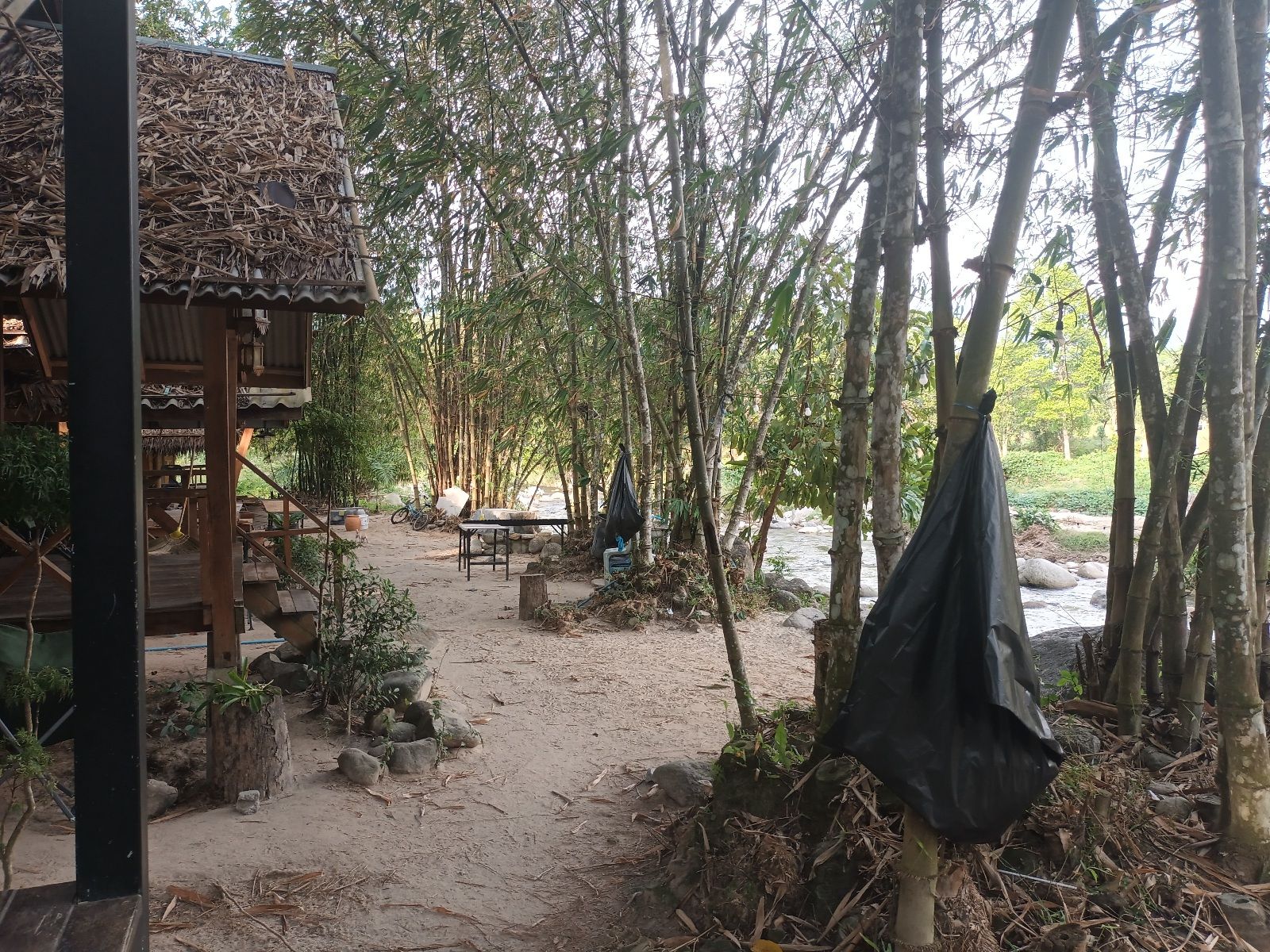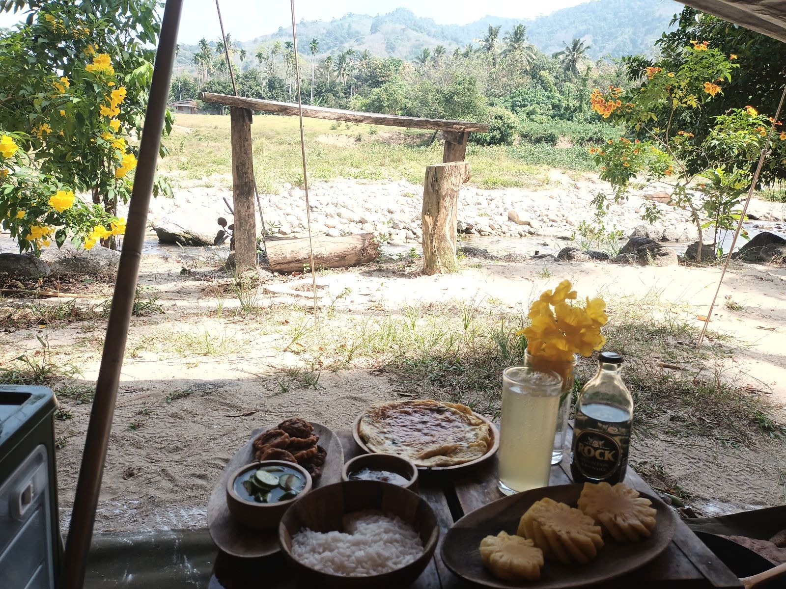 ใช้เวลาสร้างบ้านชม.ครึ่ง ขอทำมัอเที่ยงต่ออีก 40 นาที นั่งกินพร้อมชมลำธารไปด้วย อิ่ม อร่อย และมีความสุขครับ ออ จะมีน้องแงวอยู่ 2-3 ตัวชอบมาป้วนเปี้ยนด้วย น้องซนอยู่ เปิดประตูรถด้านหลัง เผลอแปปเดียว น้องกระโดดเข้ารถจนเดินกลับมาจึงกระโดดออก เต็นท์ด้วย เปิดไม่ได้ พอเดินกลับมา อ้าว รีบโดดออกมา แต่น้องไม่ได้รื้ออะไร