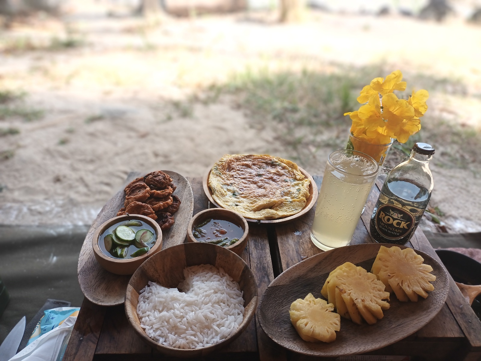 ตี 5 กว่าๆ พับเก็บผ้าห่มและเบาะรองนอนเช่นเดิม ฟ้ายังมืด จุดเตาไฟต้มแก่นฝาง ได้ไออุ่นจากไฟ รู้สึกดีมาก เตรียมเมนูอื่นๆ ขอบคุณก๋วยเตี๋ยวลุยสวนที่ลานเอามาฝากเมื่อคืน ผมเก็บในลังน้ำแข็งไว้