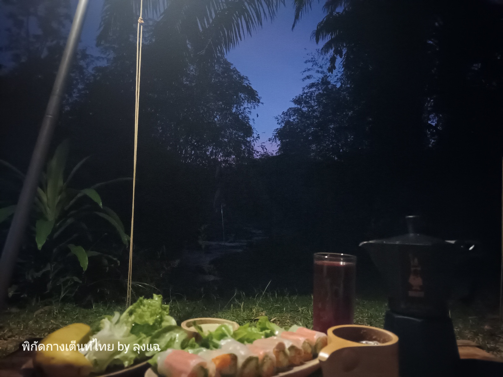 กลับมา ฟ้ามืดยิ่งขึ้น ลมยังพัดแรงสลับหยุดนิ่ง อากาศเย็นสบาย เสียงน้ำไหลของลำธารและกบเขียดร้องเป็นเพื่อนร่วมลาน ทั้งหมดคืนนี้ผมเหมาคนเดียว อิอิ