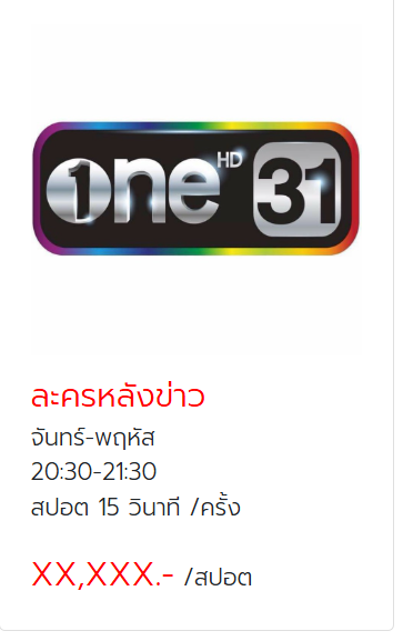 อัพเดทล่าสุด ช่องone 31 ละครหลังข่าว จันทร์-พฤหัส 20:30-21:30สปอต 15 วินาที /ครั้ง XX,XXX.- /สปอต ตัวเลขประมาณเท่าไหร่คะ