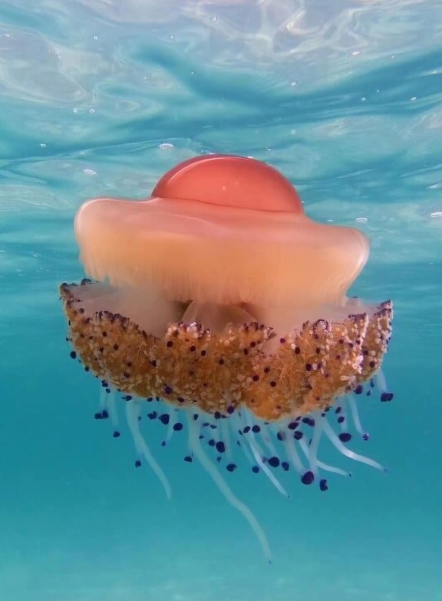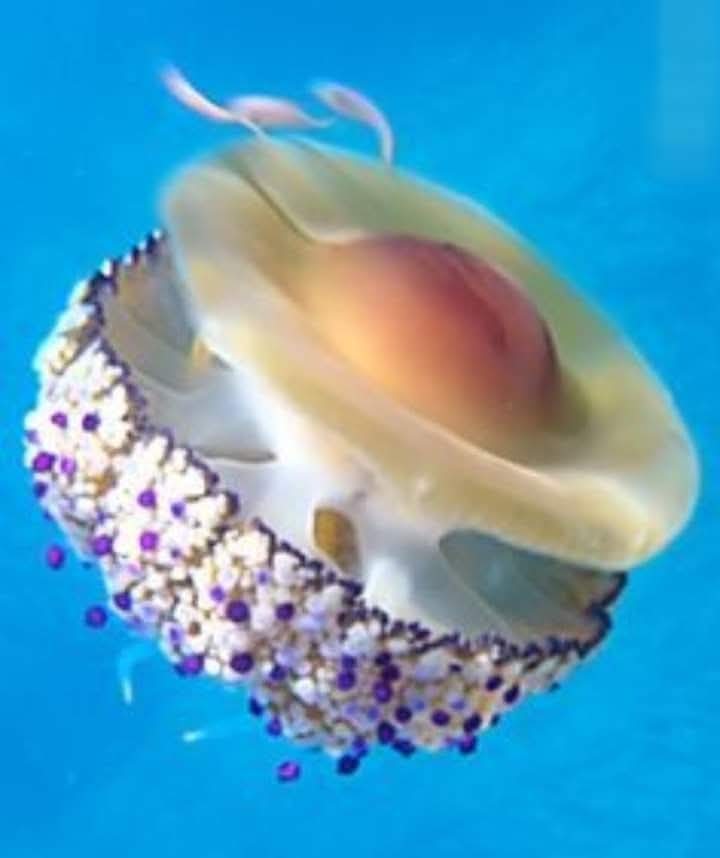 (Fried Egg Jellyfish) มีชื่อวิทยาศาสตร์ว่า Cotylorhiza tuberculata เป็นแมงกะพรุนที่มีรูปร่างโดดเด่นและน่ารักที่สุดชนิดหนึ่งในท้องทะเล โดยชื่อของมันมาจากลักษณะของร่ม (Bell) ที่ดูเหมือนไข่ดาวที่ตอกลงในกระทะอย่างไม่มีผิดเพี้ยน