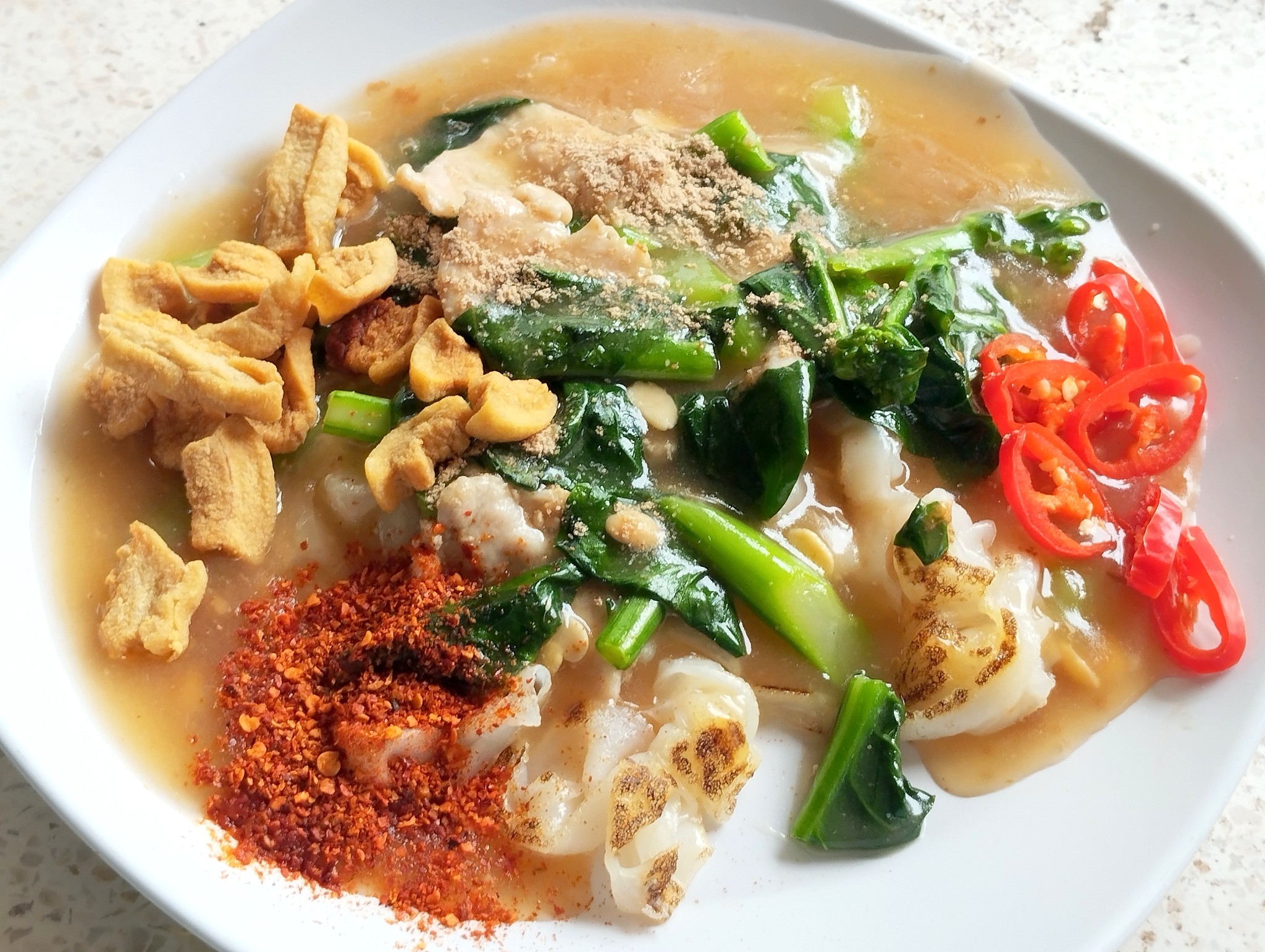 ได้ความหนืดข้นตามต้องการก็ค่อยตักราดลงบนเส้นที่เตรียมไว้ มีกากหมูที่เพิ่งเจียววันนี้ก็จัดการมาโรยนิดหน่อยเพื่อเพิ่มรสชาติ