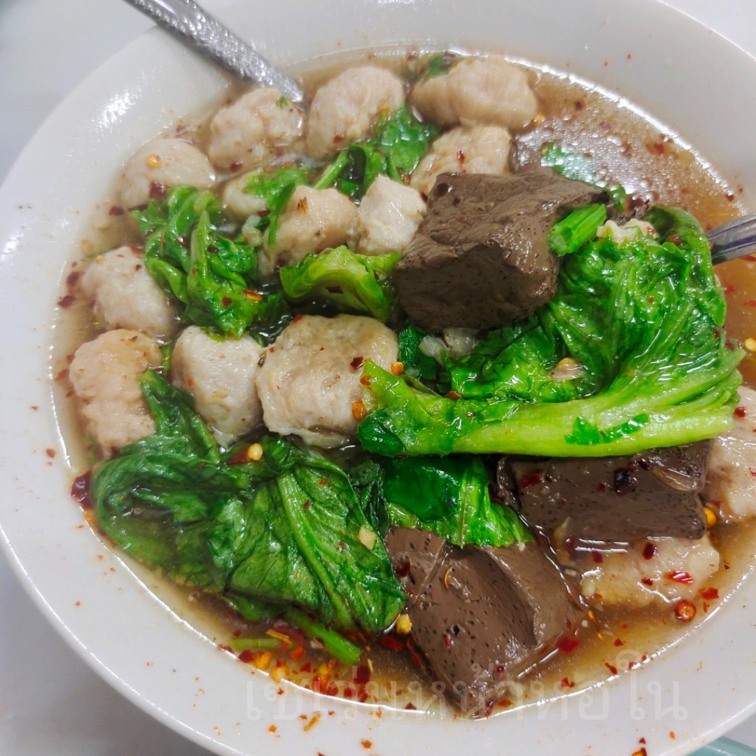 แม่ค้าจัดหมูเด้งให้แบบจุกๆเลยครับ ทำแบบต้มเลือดหมู ใส่ผักกาดหอม เลือดหมู และหมูเด้ง โรยขึ้นช่ายนิดหน่อย
