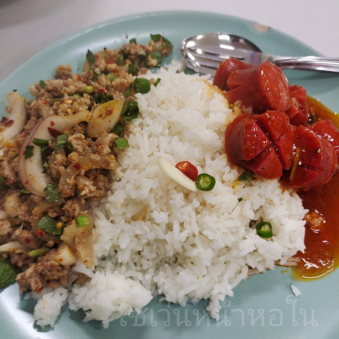ข้าวราดยืนเล็งอยู่นานว่าจะกินไรดี เลือกไส้กรอกแดงไว้ในใจละหนึ่งอย่าง