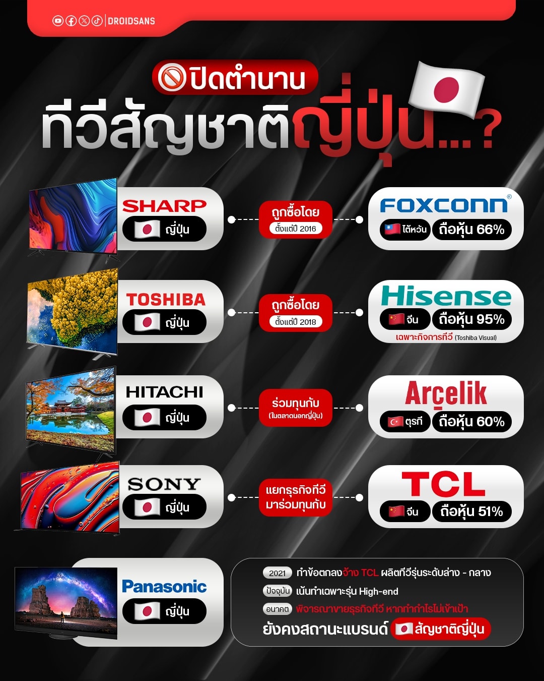 Sharp ถูกซื้อกิจการไปตั้งแต่ปี 2016 โดย Foxconn จากไต้หวัน เข้ามาถือหุ้นใหญ่ประมาณ 66% เพื่อกอบกู้สถานการณ์การเงินของ Sharp ในตอนนั้น