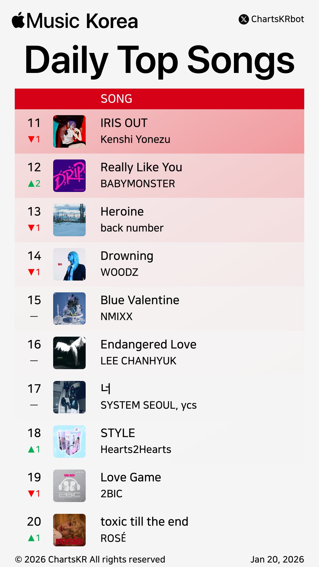 เพลง Really Like You ของ BABYMONSTER ยังคงอยู่ในอันดับ 14 บน Apple Music South Korea Chart หลังจากปล่อยเพลงมากว่า 1 ปี อยู่เหนือเพลงดังๆที่ติดอันดับ Top 20 บน Melon Chart หลายต่อหลายเพลง อย่างเพลง Blu