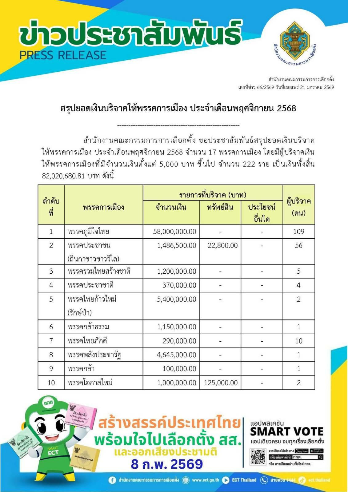 กกต.สรุปยอด ‘เงินบริจาค’ ให้พรรคการเมือง ประจำเดือน ‘พฤศจิกายน 2568’ จำนวน 17 พรรคการเมือง