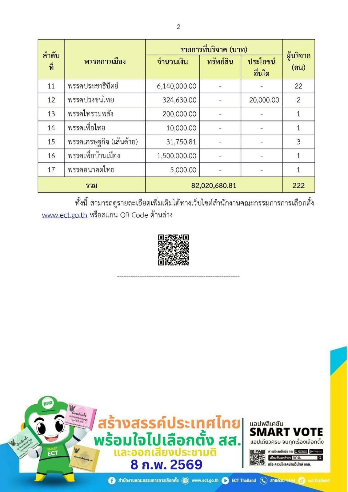 ให้พรรคการเมืองที่มีจำนวนเงินตั้งแต่ 5,000 บาท ขึ้นไป จำนวน 222 ราย เป็นเงินทั้งสิ้น