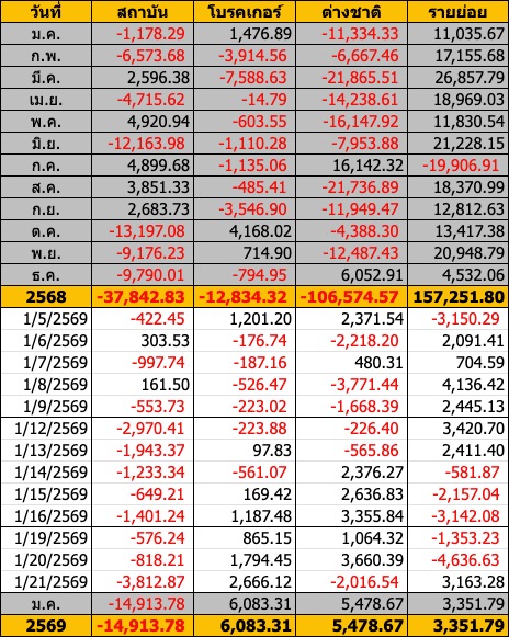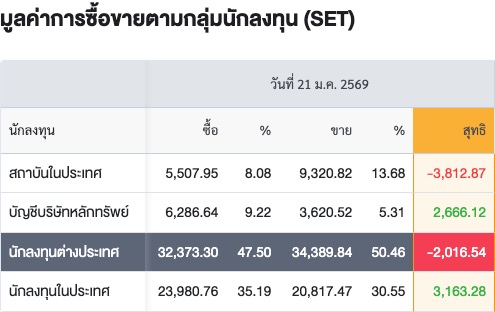 Sinthorn Summary 21/1/2569 : ต่างชาติขายสุทธิ -2,016.54 ลบ.