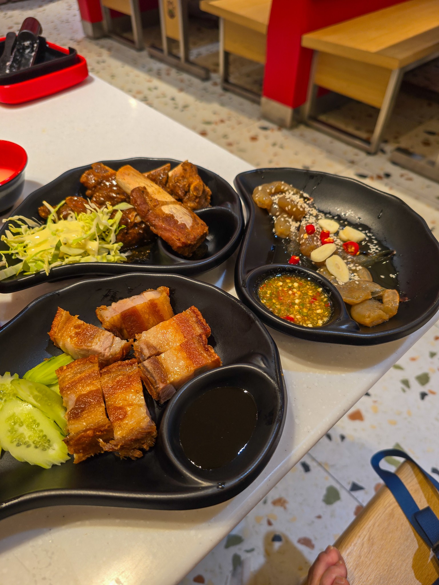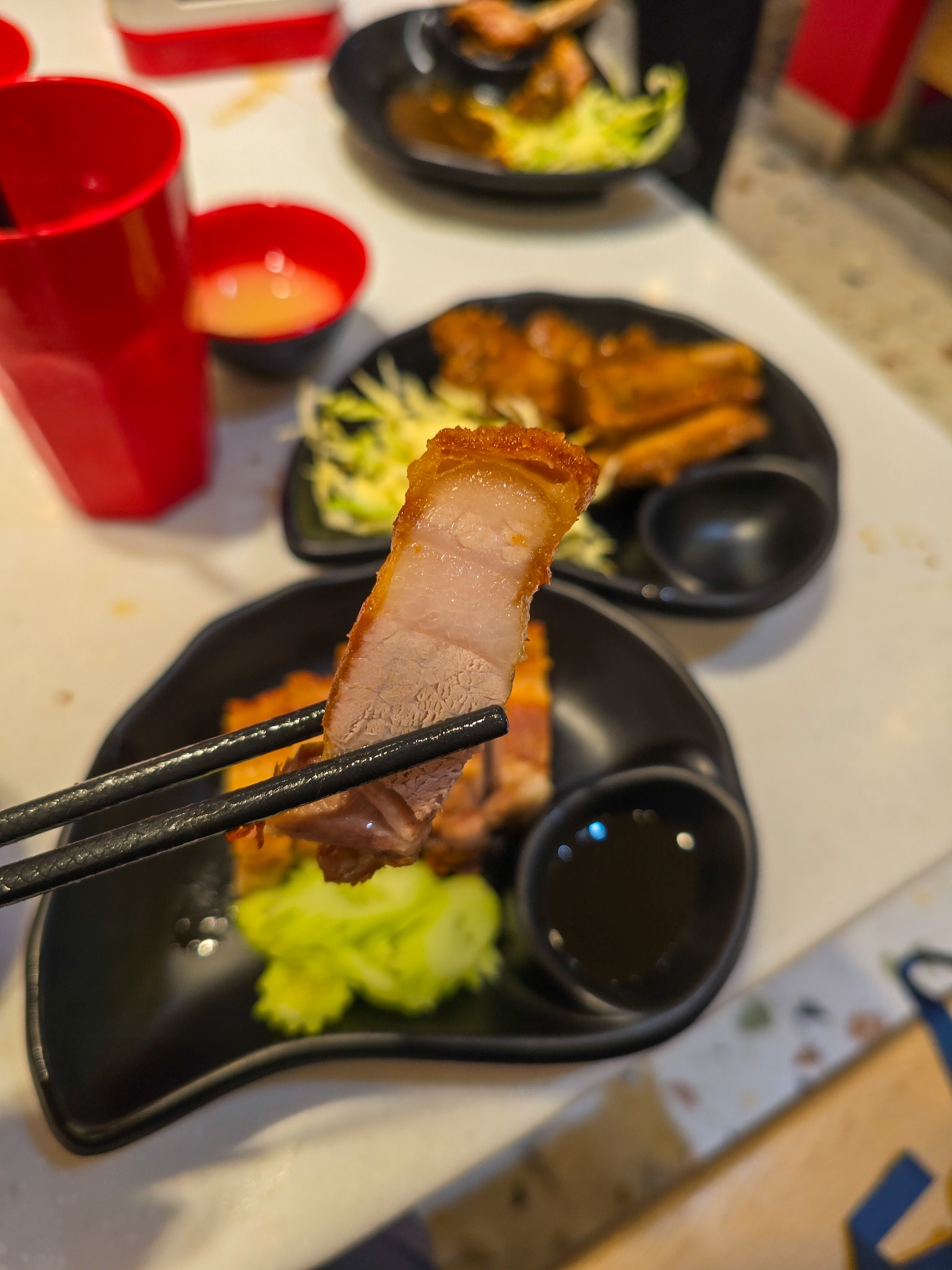 อันนี้คือไฮไลท์ที่ทำให้ผมยอมขับรถมากินเลยครับ กลับมาอีกครั้งสำหรับ "หมู Half" หรือหมูกรอบในตำนาน ชิ้นโต เนื้อนุ่ม หนังกรอบมากกกก พูดแบบไม่อวยเลยนะ ผมว่าดีกว่าหมูกรอบใน Buffet ราคา 899 ของแบรนด์ดังห้างแตกอีกครับ อันนั้นบางทีเจอชิ้นเล็ก เหนียว แถมแข็ง แต่อันนี้คือฟินจริง ผมสั่งมา 6 ที่จุกๆ กินคู่กับซี่โครงหมูบาร์บีคิว (สั่งมา 5 ที่) นุ่มซอสเข้าเนื้อดีครับ