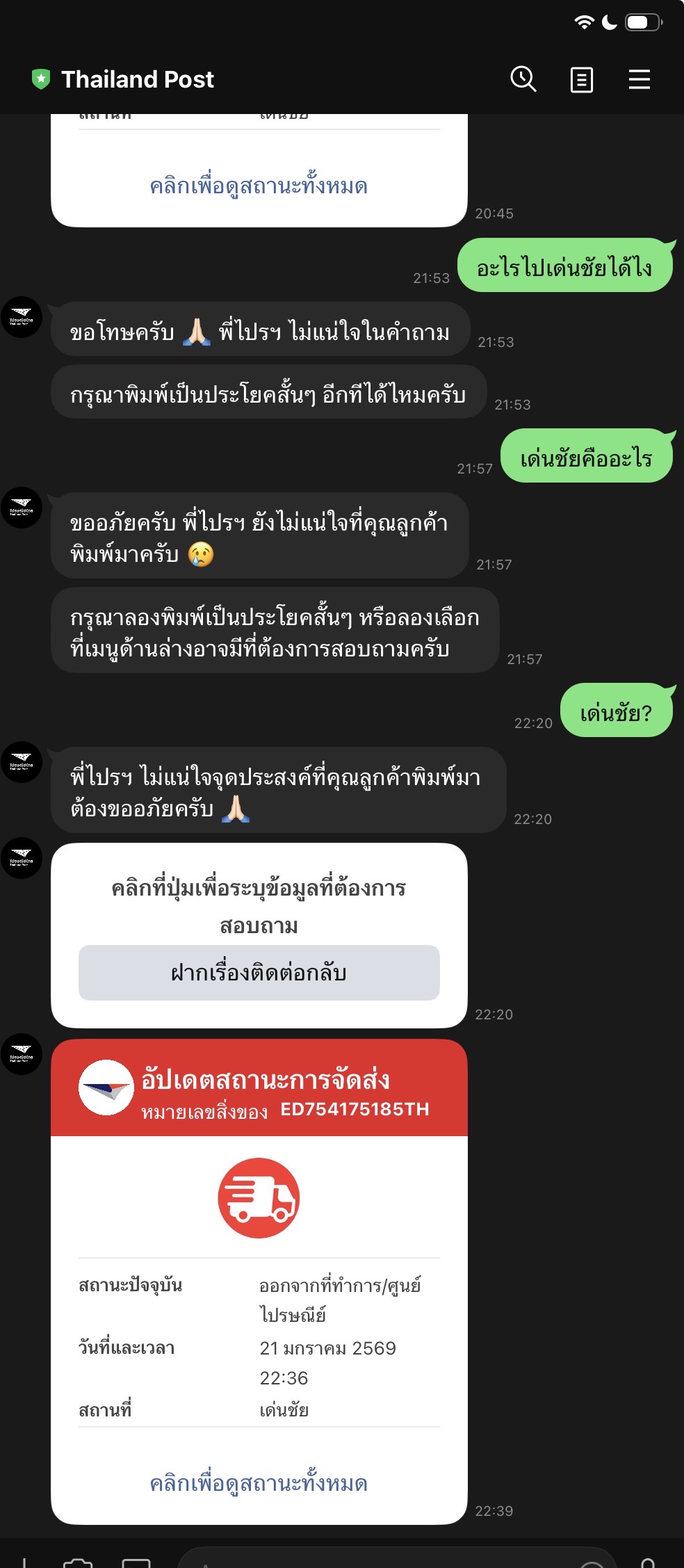 สวัสดีค่ะ ขอปรึกษาคือวันนี้ร้านค้า ที่อยู่อ.เมือง จ.น่าน ได้ส่งของให้เรา เราให้ที่อยู่ของเราให้ร้านเขามาส่งพัสดุเรามาที่ที่อยู่เราใน อำเภอเชียงกลาง จ. น่าน แบบEMS เราให้รหัสไปรษณีย์ถูก ที่อยู่ในอำเภอเชียงกลางถูก ชื่อหมู่ ทุกอย่างถูก เบอร์โทรถูก ร้านอัดคลิปแพ็คกล่องพัสดุมาให้เช็ค มีชื่อเราบนกล่องพัสดุ ที่อยู่ รหัสไปรษณีย์ถูกต้อง เราดูในระบบตอนนี้ของอยู่ ปณ.เด่นชัย เราอยู่อำเภอเชียงกลาง จ.น่าน พัสดุควรอยู่ที่ไปรษณีย์บริเวณในจังหวัดน่านเช่น ปณ.ท่าวังผา ปณ.ปัว หรือปล่าวคะ แล้วตอนนี้พัสดุกำลังไปเด่นชัย จ.แพร่ได้ไงคะ อันนี้เรา งง มากจริงๆ สาเหตุที่เราไม่ไปรับของที่ร้านเองใน อำเภอเมืองเพราะเราไม่ว่างค่ะติดงาน อำเภอห่งกัน78กิโล