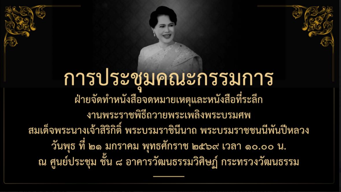 วันที่ 21 มกราคม 2569 เวลา 10.00 น. นางสาวซาบีดา ไทยเศรษฐ์ รัฐมนตรีว่าการกระทรวงวัฒนธรรม เป็นประธานการประชุมคณะกรรมการฝ่ายจัดทำหนังสือจดหมายเหตุและหนังสือที่ระลึกงานพระบรมศพสมเด็จพระนางเจ้าสิริกิติ์ พระบรมราชินีนาถ พระบรมราชชนนีพันปีหลวง ครั้งที่ 1/2569 โดยมี นายประสพ เรียงเงิน ปลัดกระทรวงวัฒนธรรม นายพนมบุตร จันทรโชติ อธิบดีกรมศิลปากร พร้อมด้วยคณะกรรมการฝ่ายจัดทำหนังสือจดหมายเหตุและหนังสือที่ระลึกฯ ผู้เชี่ยวชาญ ผู้ทรงคุณวุฒิ และผู้แทนหน่วยงานที่เกี่ยวข้องเข้าร่วมประชุม ณ ศูนย์ประชุมกระทรวงวัฒนธรรม ชั้น 8 อาคารวัฒนธรรมวิศิษฏ์ กระทรวงวัฒนธรรม