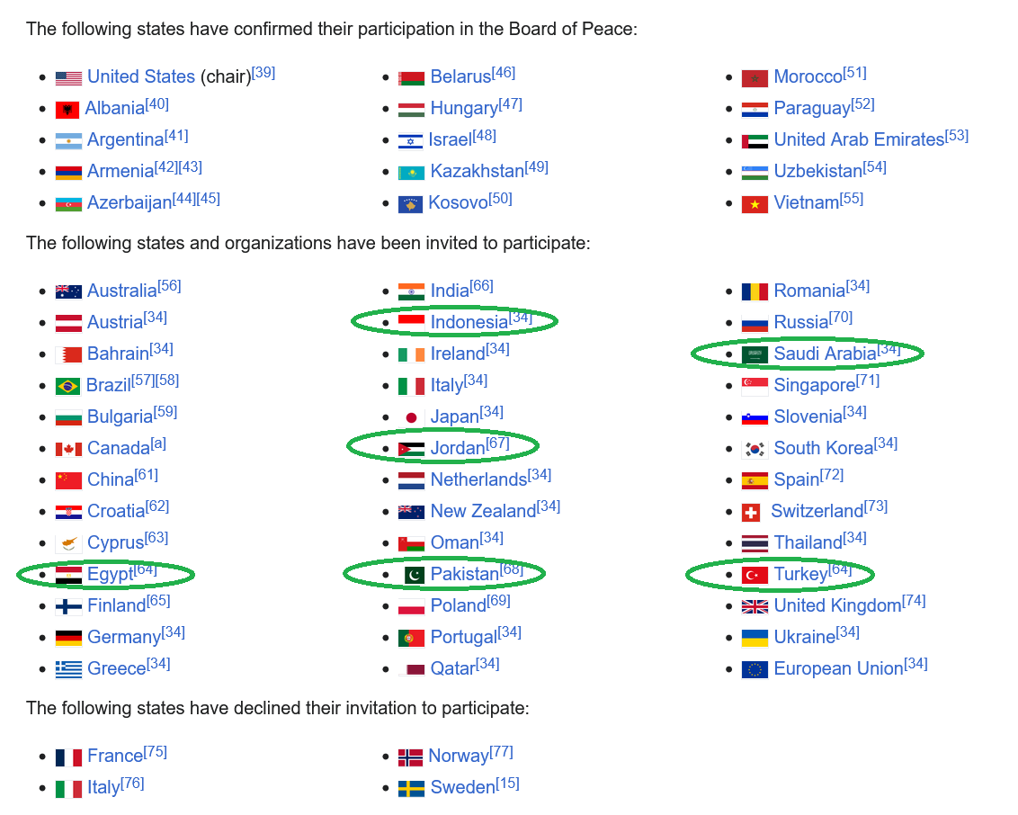 - ไม่ถึงครึ่งชั่วโมงที่ผ่านมา สื่ออาหรับรายงานว่าชาติมุสลิม ได้แก่ ซาอุดีอาระเบีย, กาตาร์, จอร์แดน, ตุรกี และอินโดนีเซีย เข้าร่วม Board of Peace