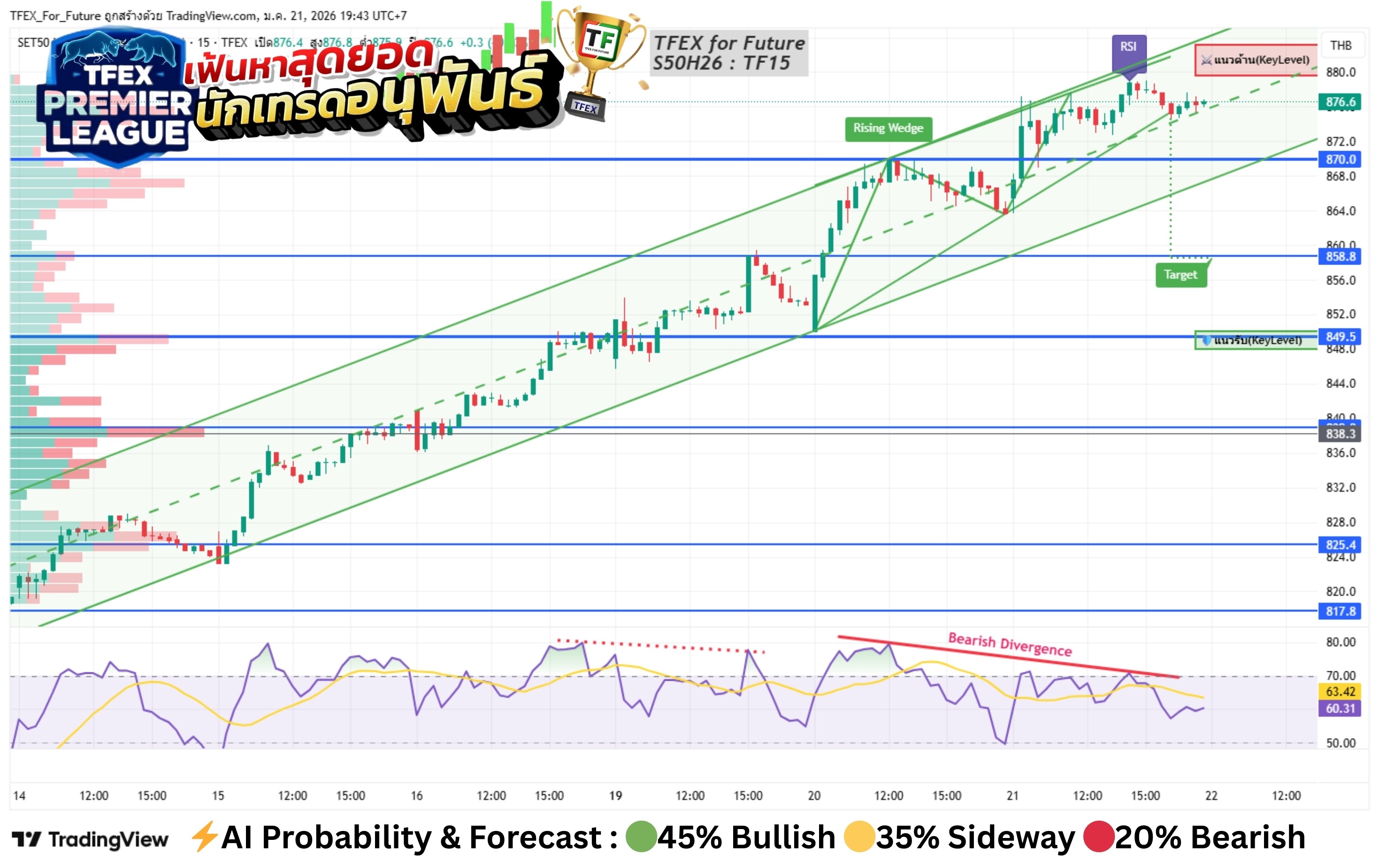 📉 Outlook&Tactical Plan : ยังอยู่ในเทรนขาขึ้น Rally เดิม(กรอบเขียว) ภายในเทรนเกิด RisingWedge พร้อม Bearish Divergence เป้าหมายล่าง 858 ล้างได้ถ้าทำ NewHigh ทะลุ 880