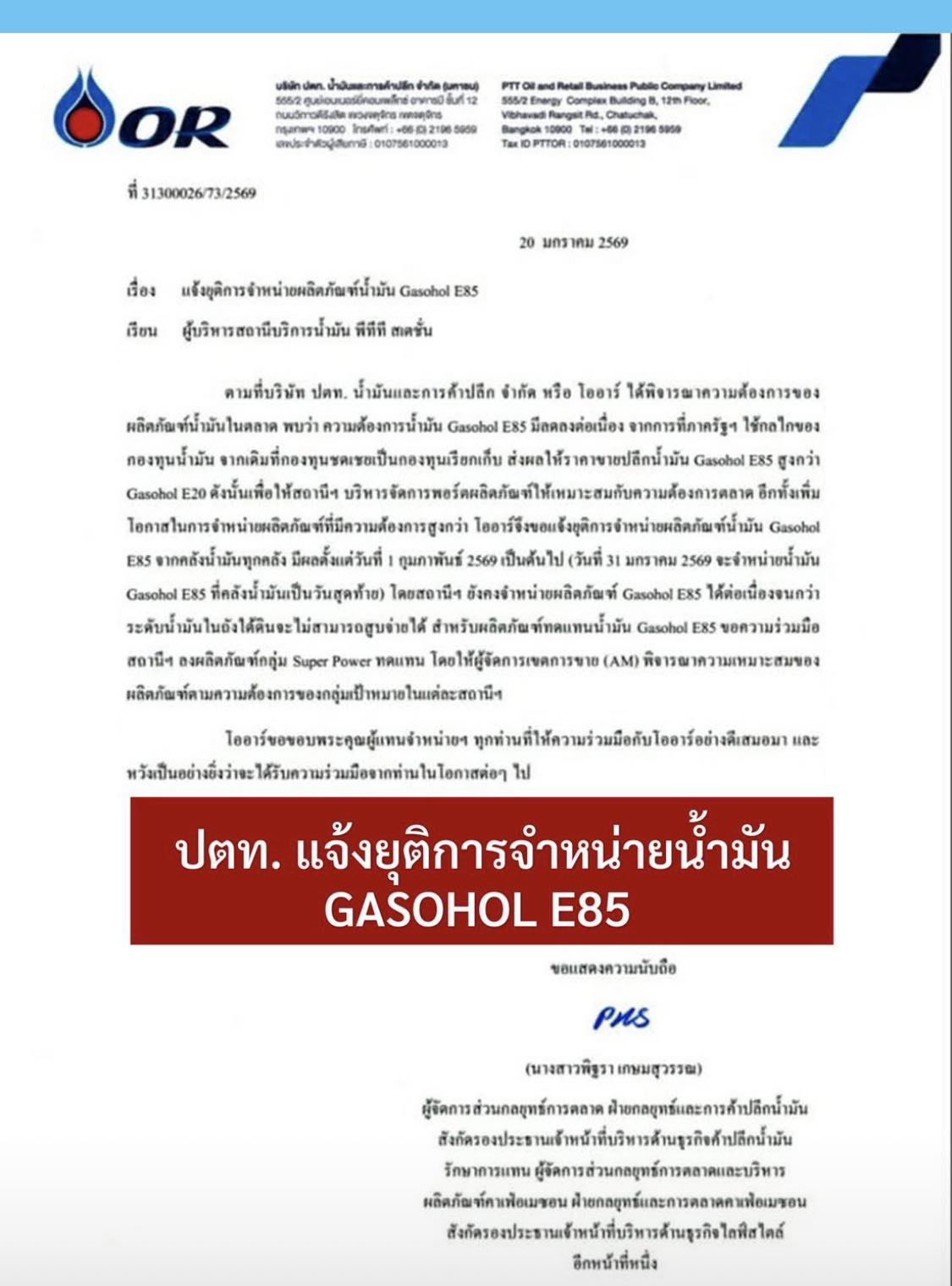 ปตท.น้ำมันและการค้าปลีก หรือ PTT OR แจ้งยุติการจำหน่ายน้ำมัน GASOHOL E85 (แก็สโซฮอลล์ E85)