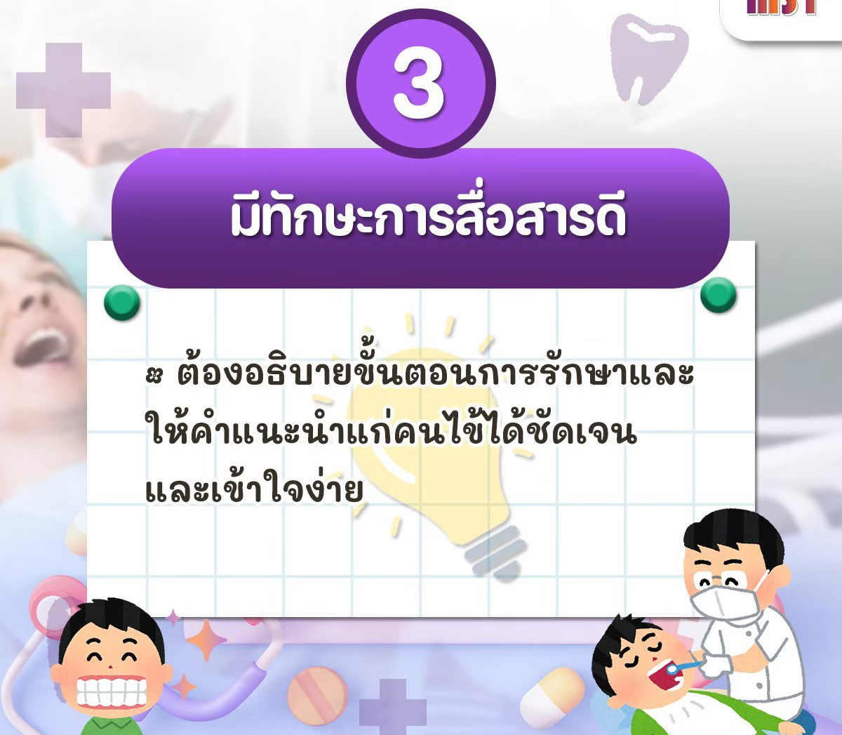 สามารถอธิบายขั้นตอนการรักษาและให้คำแนะนำแก่คนไข้ได้อย่างชัดเจน ช่วยลดความกังวลและสร้างความเข้าใจ