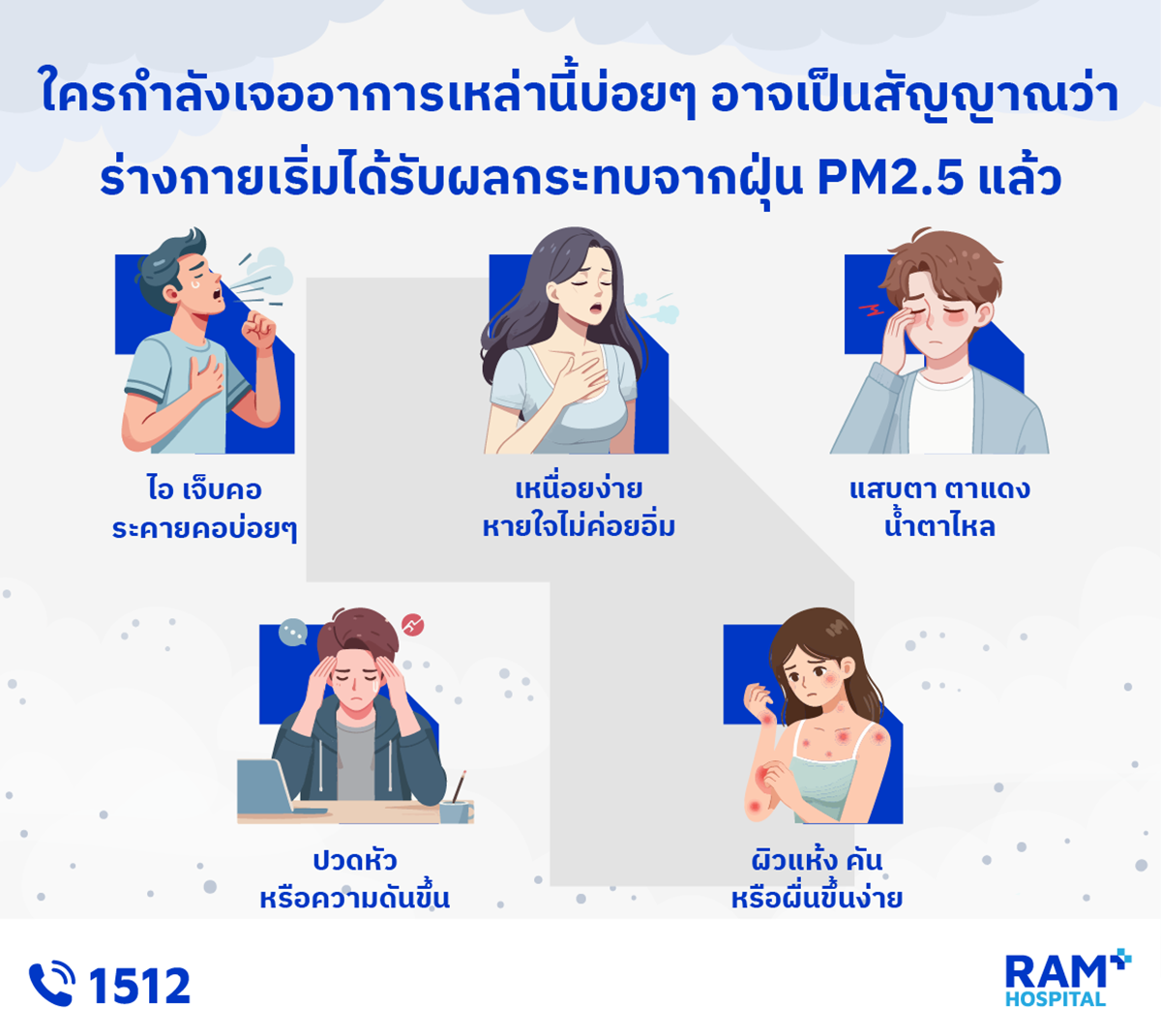 ถ้าใครมีอาการเหล่านี้ต่อเนื่อง หรือรู้สึกว่าอาการหนักขึ้น แนะนำว่าอย่ามองข้ามนะคะ ควรไปพบแพทย์เพื่อตรวจให้แน่ใจ และช่วงนี้พยายามหลีกเลี่ยงออกไปข้างนอก หรือเช็กค่าฝุ่นก่อนออกจากบ้าน ใส่หน้ากากกันฝุ่น และดูแลสุขภาพตัวเองให้มากขึ้นค่ะ…