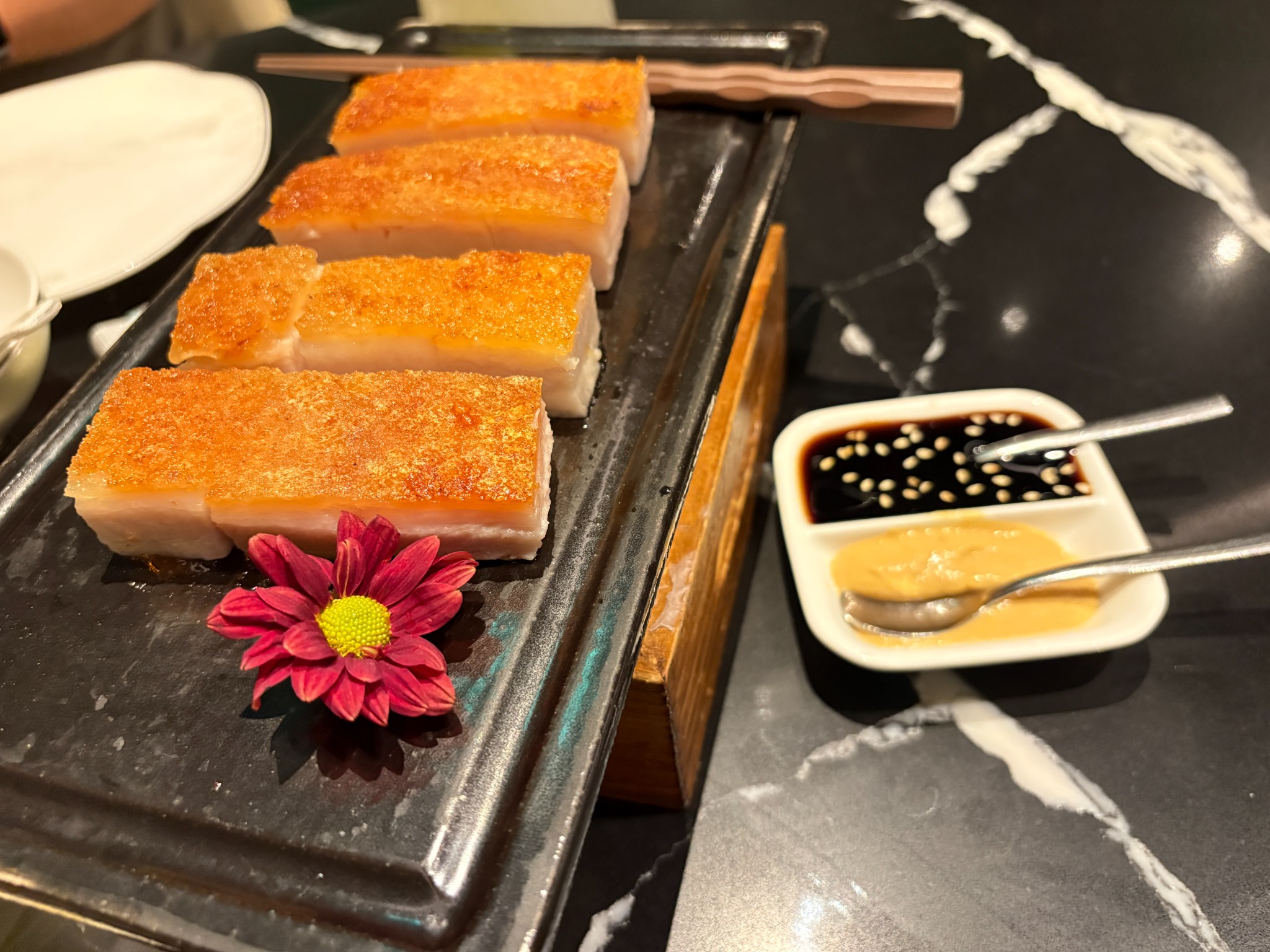 หนึ่งในเมนู Siu Mei ซิกเนเจอร์ของร้าน เชฟย่างหมูสามชั้นถึง 3 รอบ ได้หนังกรอบไร้มัน เนื้อนุ่มฉ่ำ เสิร์ฟพร้อมซอสสูตรเฉพาะ ซีอิ๊วฮ่องกง และมัสตาร์ด จิ้มได้ตามชอบ