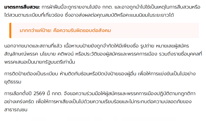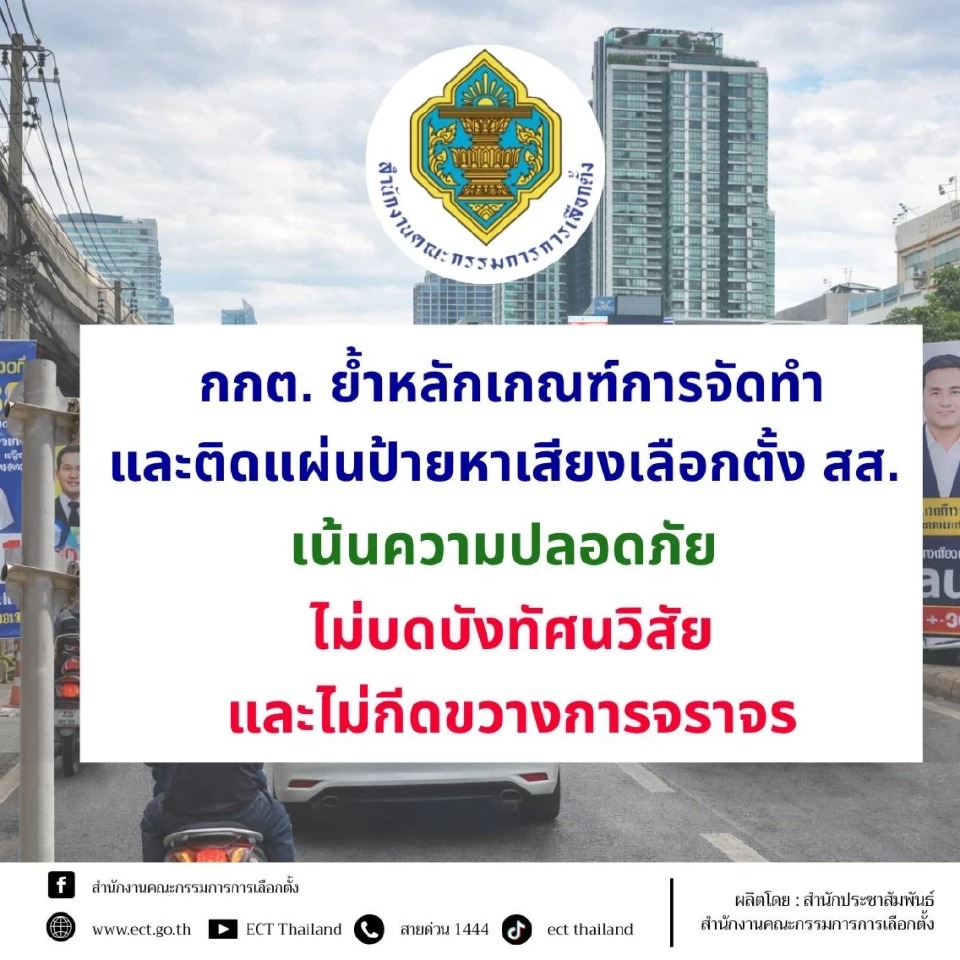 กกต. ย้ำกฎเหล็กการจัดทำและติดตั้งป้ายหาเสียงเลือกตั้ง สส. ปี 2569 ต้องไม่บดบังการจราจรหรือกีดขวางทางสัญจร กำหนดขนาด จำนวน และพื้นที่ติดตั้งชัดเจน ฝ่าฝืนมีโทษตั้งแต่สั่งแก้ไข รื้อถอน ไปจนถึงการสืบสวนทางกฎหมาย