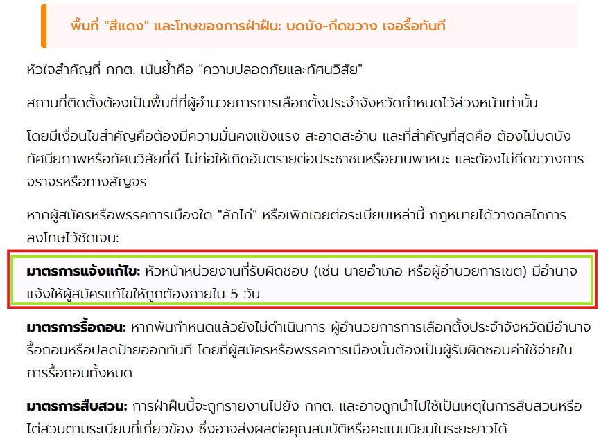 ป้ายหาเสียงต้องติดตั้งเฉพาะพื้นที่ที่ผู้อำนวยการการเลือกตั้งจังหวัดกำหนด ต้องมั่นคง สะอาด และไม่บดบังทัศนวิสัยหรือกีดขวางการจราจร หากฝ่าฝืน เจ้าหน้าที่มีอำนาจแจ้งให้แก้ไขภายใน 5 วัน หากไม่ดำเนินการจะถูกรื้อถอนทันทีโดยผู้สมัครหรือพรรคต้องรับผิดชอบค่าใช้จ่ายทั้งหมด และอาจถูกรายงานให้ กกต. พิจารณาสืบสวน ซึ่งอาจกระทบต่อคุณสมบัติและความน่าเชื่อถือทางการเมืองในระยะยาว
