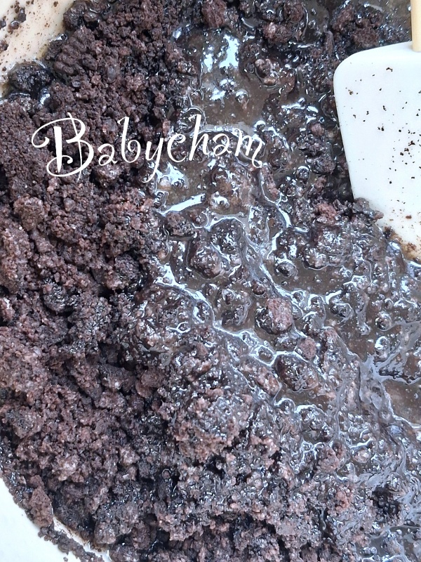 แล้วก็มาบดคุกกี้ ผสมกับเนยละลายเพื่อทำเป็นฐานพาย ที่ต้องโอริโอ เพราะครั้งก่อนที่ทำเด็กๆบอกชอบมากกว่าบิสกิต ครัวนี้ตามใจคนกิน