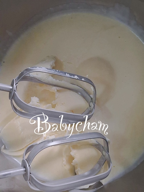 ตีไล่ระดับไปจนได้เนื้อเนียนตามต้องการ .....ถ้าเนย นม ครีม ชีส อะไรพวกนี้ แม่เปปจะต้องมีติดตู้ไว้ตลอดค่ะ เผื่อสถานการณ์วิกฤต เช่นครั้งนี้