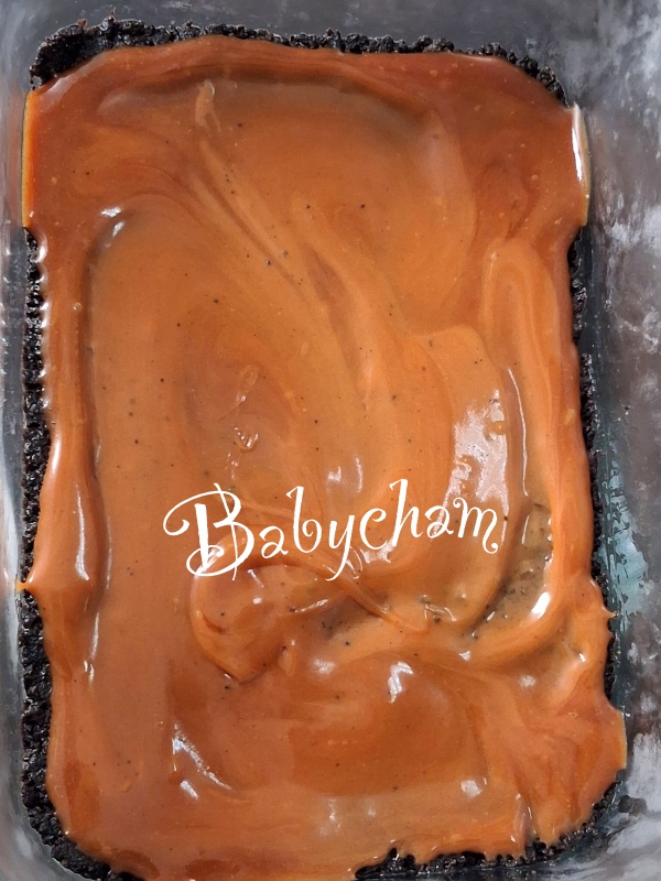 คาราเมลราดลงไปบนฐานพายเลย เกลี่ยๆให้ทั่วถึงหน่อย