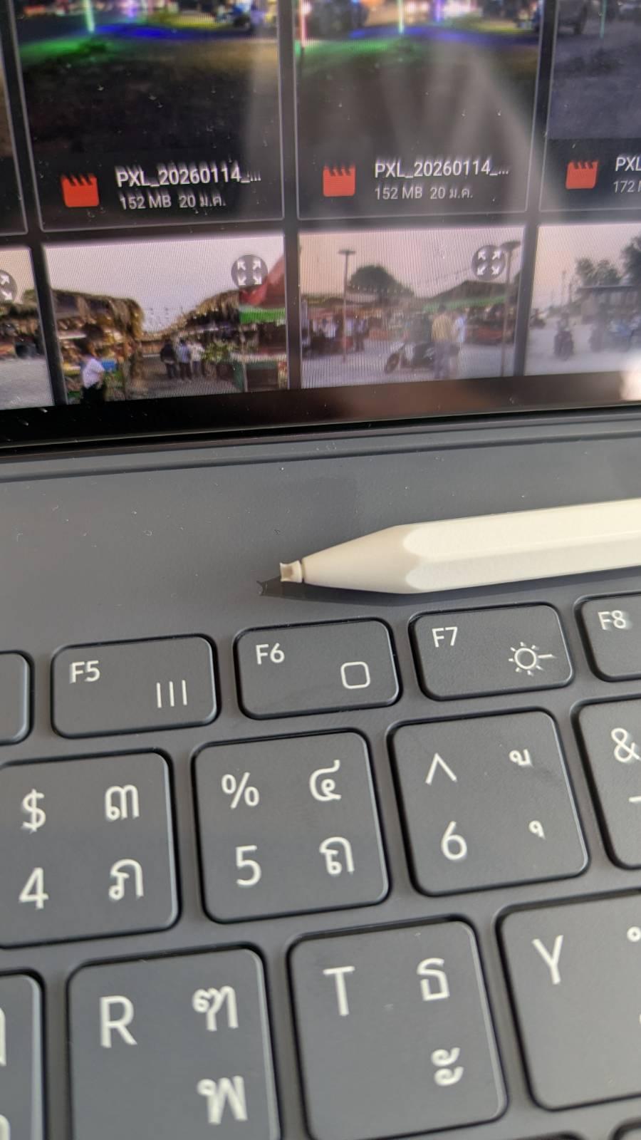 ตามรูปด้านล่าง กำลังจะเก็บแท็บเล็ตใส่กระเป๋า ปากกาเจ้ากรรม หลุดจากตัวแท็บแล็ตลงพื้นซะได้ ตัวคีบอร์ดเคส ไม่มีที่เก็บปากกา ลองเอามาใช้ ยังสามารถใช้งานได้ตามปกติ แต่ปลายปากกาสภาพตามรูปเลย ซื้อใหม่ที่งดงาม พันนิดๆ ไม่รู้ที่ศูนย์มีเปลี่ยนเฉพาะไส้หรือเปล่า โทรถาม 3 ศูนย์(ศูนย์ซ่อม) ไม่มีอะไหล่ของ S11 Ultra เลย ตัวนี้ไม่อยู่ใน ประกัน SC+ แต่ละศูนย์ก็ไม่สามารถเช็คได้ว่าศูนย์อื่นมีอะไหล่หรือไม่ ลูกค้าต้องหาเอง หาไม่ได้ขายขาดทุนดีไหม ตามหาอะไหล่ยากเหลือเกิน ทั้งชุด 20,000฿ แถมปากกาที่ไส้พัง ประกัน SC+ 2 ปี ชื้อมา 46K+ หลังใช้ส่วนลดแล้ว