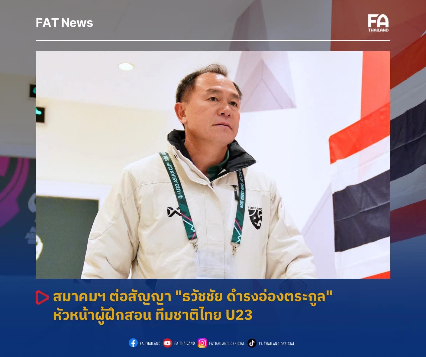 ⚽🇹🇭 สมาคมฯ ต่อสัญญา "ธวัชชัย ดำรงอ่องตระกูล" หัวหน้าผู้ฝึกสอนทีมชาติไทย U23 ทำหน้าที่ถึงเอเชียนเกมส์ ครั้งที่ 20