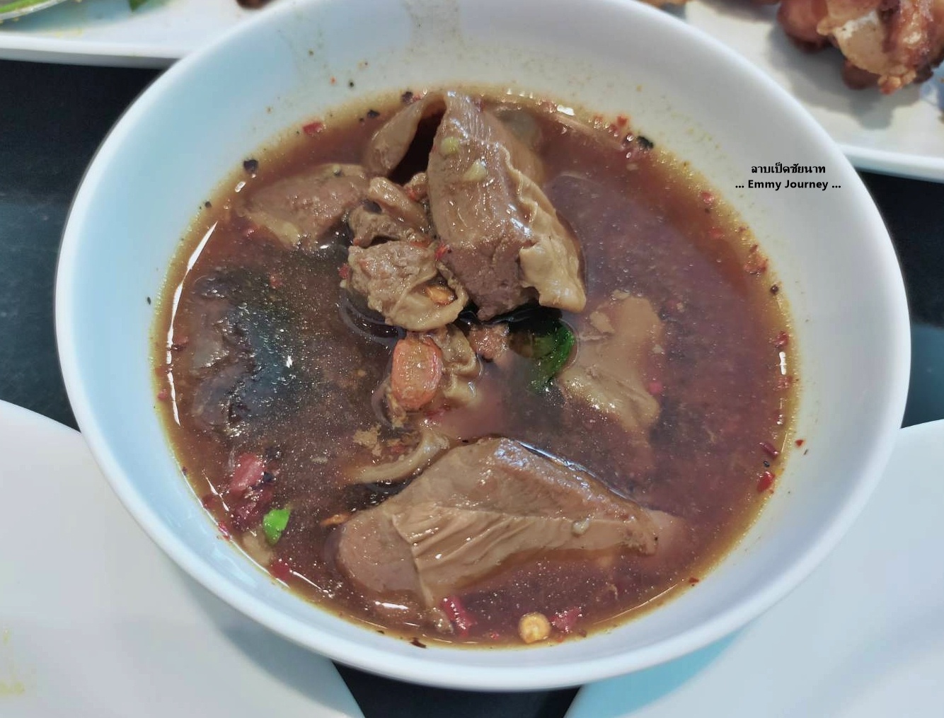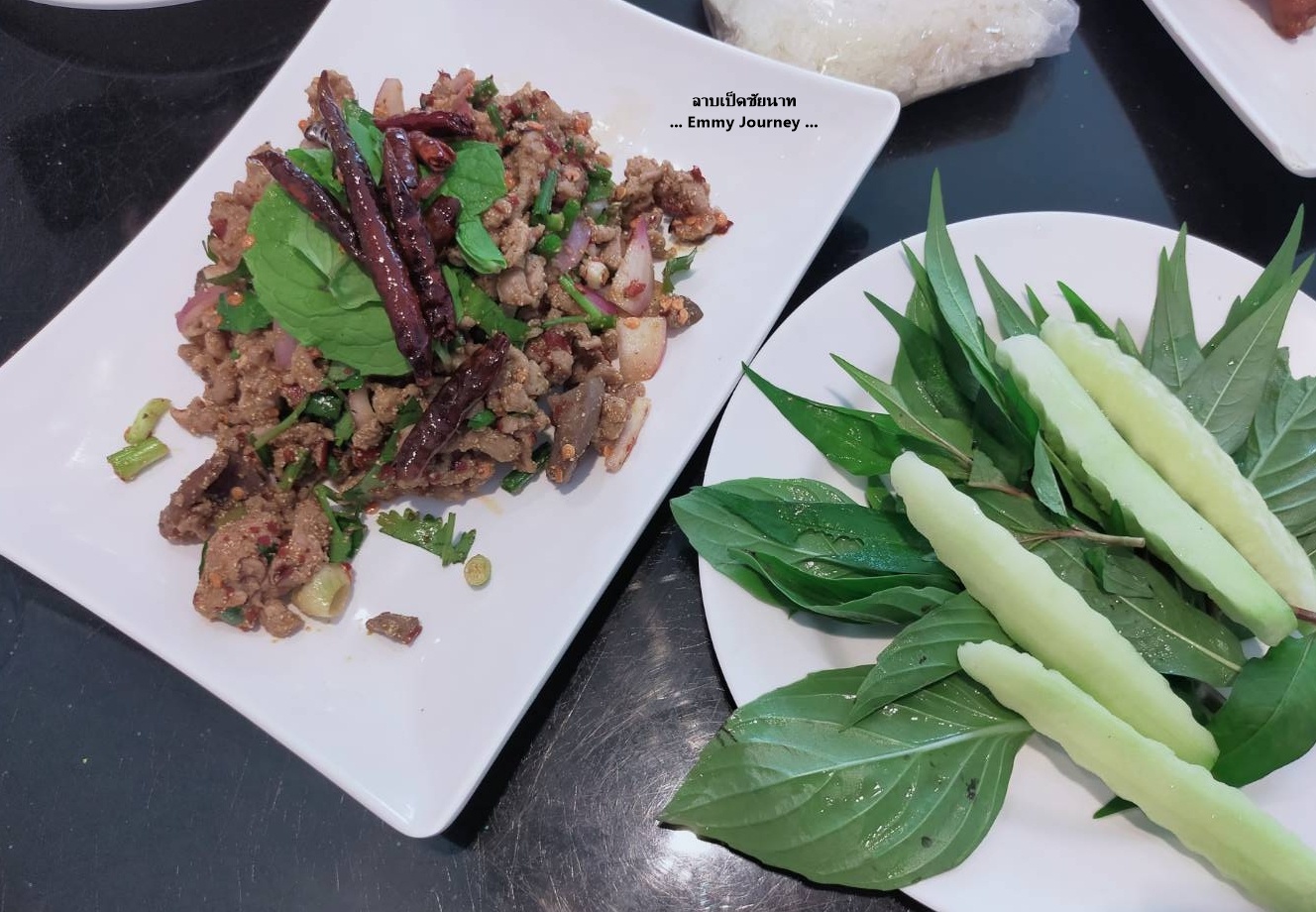 ลาบเป็ดจานละ 110 บาท รสจัดไปทางเผ็ดแต่อร่อย (ใครไม่ทานเผ็ดแจ้งทางร้านได้นะ) หอมข้าวคั่วและสมุนไพรสด รสชาติกลมกล่อม ทางร้านปรุงแบบไม่มันเยิ้ม น้ำไม่เจิ่ง คือดีมาก
