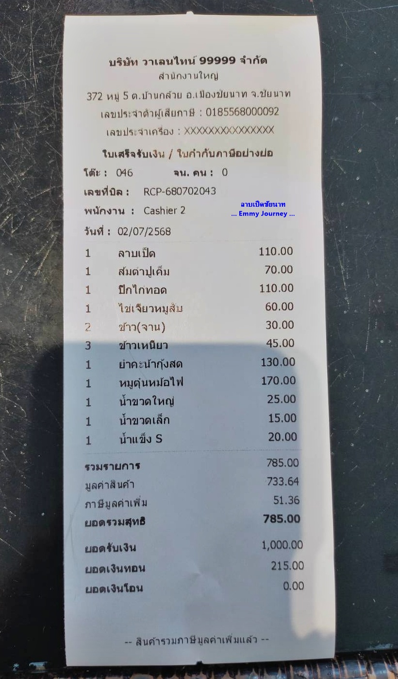 จ่ายไปทั้งสิ้น 785 บาท (ราคาอาหารเมื่อวันที่ 2 กรกฎาคม 2568)