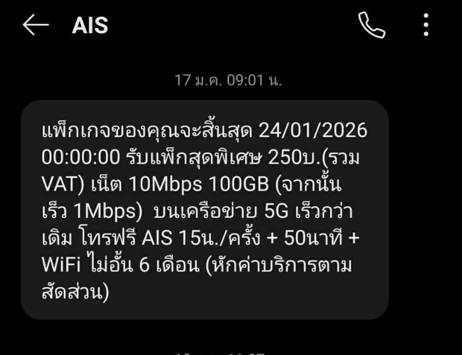 ขอบคุณที่ชำระค่าแพ็ก 125.00บ. ใช้เน็ตได้ 50.00GB ใช้ได้ถึง 05/02/2026 23:59:59 (ตัดค่าบริการได้ตามสัดส่วนของแพ็ก250บ. เน็ต100GB(เร็ว10Mbps) โทรฟรี WiFi 30วัน เพื่อให้คุณใช้งานได้ต่อเนื่อง) แบบนี้รอบใ