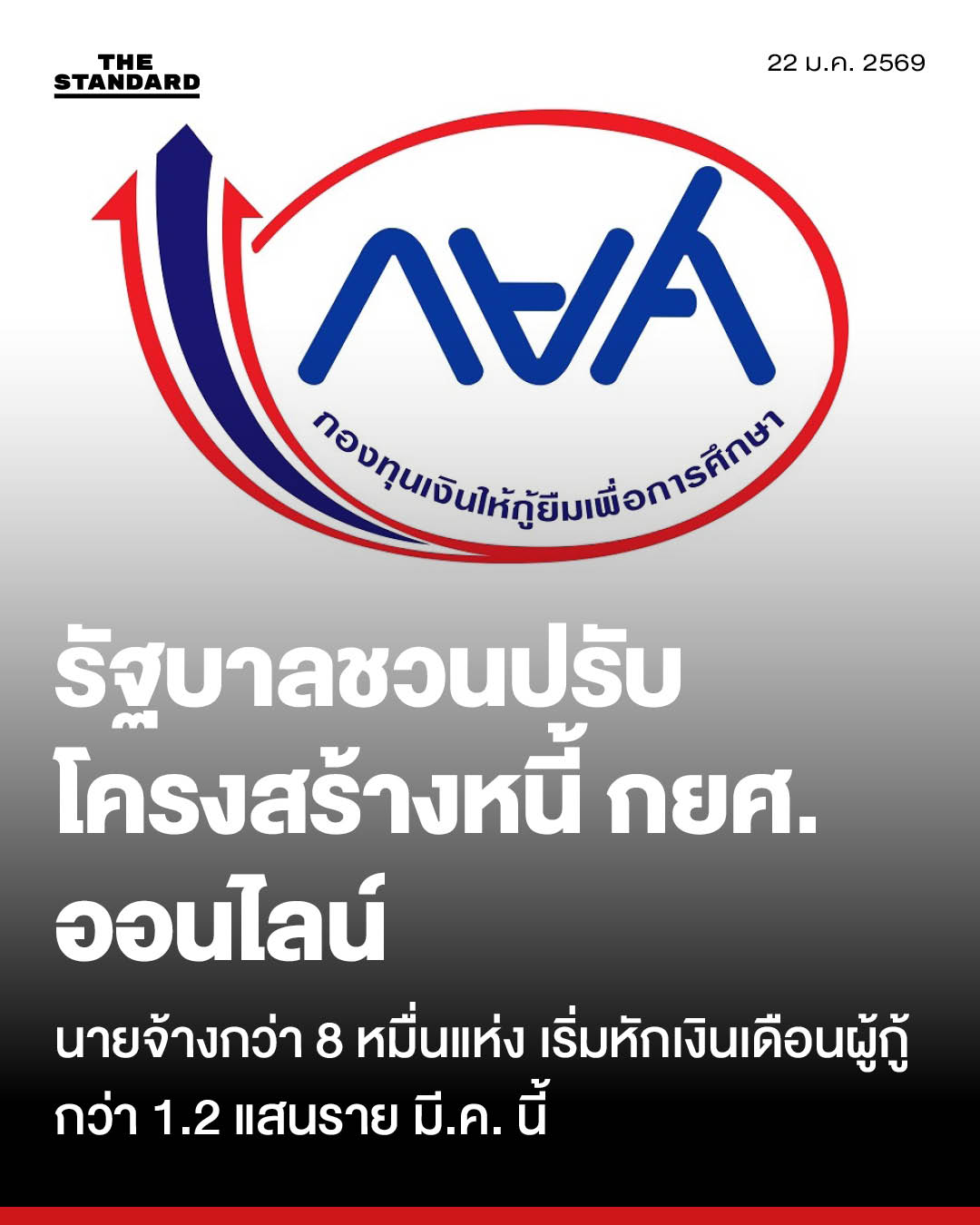 วันนี้ (21 มกราคม) อัยรินทร์ พันธุ์ฤทธิ์ รองโฆษกประจำสำนักนายกรัฐมนตรี เปิดเผยว่า กองทุนเงินให้กู้ยืมเพื่อการศึกษา (กยศ.) ได้ส่งหนังสือแจ้งไปยังองค์กรนายจ้างจำนวนกว่า 80,000 แห่ง เพื่อดำเนินการหักเงินเดือนของพนักงานหรือลูกจ้างที่เป็นผู้กู้ยืมเงิน จำนวนกว่า 120,000 ราย ตั้งแต่เดือนมีนาคม 2569 เป็นต้นไป โดย กยศ. จะส่งหนังสือแจ้งให้ผู้กู้ยืมทราบในเดือนกุมภาพันธ์นี้