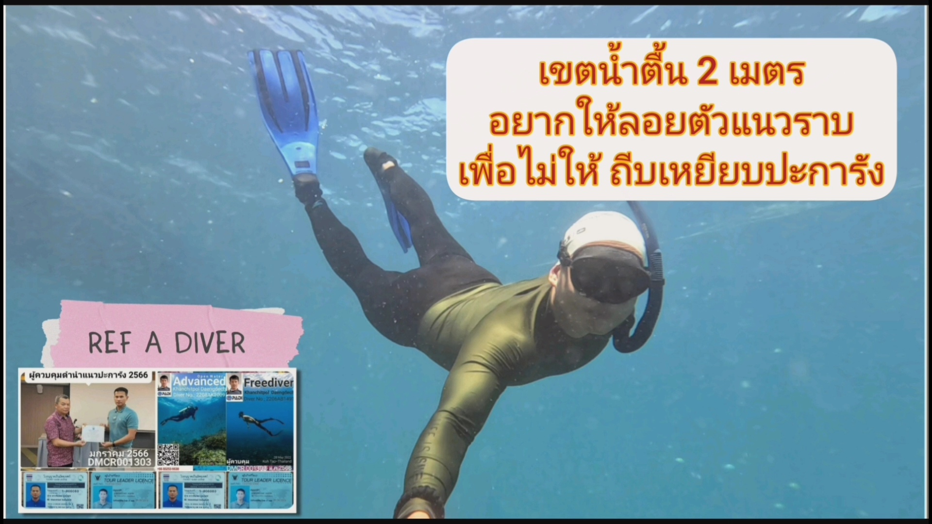 I proud to be a Diver person. ร่วมกันส่งเสริมนักดำน้ำอิสระ มีบัตรนักดำน้ำและชื่ออยู่ทะเบียนนักดำน้ำของสถาบันดำน้ำ ตามประกาศ ราชกิจจาฯ ประกาศมาตรการคุ้มครองปะการัง 26 มีนาคม 2568 • (11) นักท่องเท