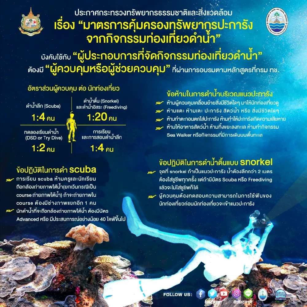 กฎหมายผู้ควบคุมดำน้ำแนวปะการังในไทย (ประกาศปี 2568) มีเป้าหมายเพื่อปกป้องปะการัง โดยกำหนดให้ผู้ควบคุมต้องดูแลอัตราส่วนนักดำน้ำ (Scuba) ไม่เกิน 1 ต่อ 4 คน, ห้ามเคลื่อนย้ายสิ่งมีชีวิต, ห้ามแตะต้องปะการัง, ห้ามให้อาหารสัตว์, และห้ามทิ้งขยะหรือเดินบนพื้นทะเล (Sea Walker) ที่สำคัญคือ ห้ามนักดำน้ำทั่วไปถ่ายรูปใต้น้ำ ยกเว้นผู้มีประสบการณ์สูง (AOW/40 ไดฟ์+) โดยมีโทษปรับและจำคุกสำหรับผู้ฝ่าฝืน เพื่อให้อนุรักษ์ทรัพยากรปะการังอย่างยั่งยืน.