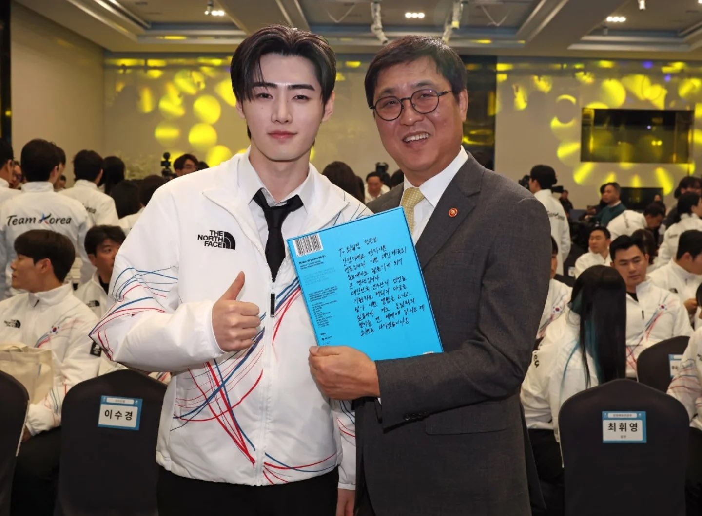 รัฐมนตรีว่าการกระทรวงวัฒนธรรม กีฬา และการท่องเที่ยวแห่งสาธารณรัฐเกาหลี แช ฮวี-ยอง ถ่ายภาพร่วมกับ SUNGHOON ทูตของคณะกรรมการโอลิมปิกแห่งเกาหลี ในพิธีส่งตัวนักกีฬาไปแข่งขันกีฬาโอลิมปิกฤดูหนาว