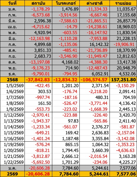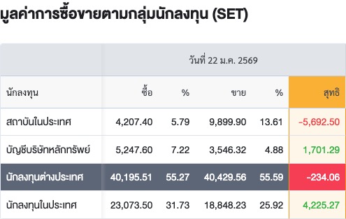 Sinthorn Summary 22/1/2569 : ต่างชาติขายสุทธิ -234.06 ลบ.