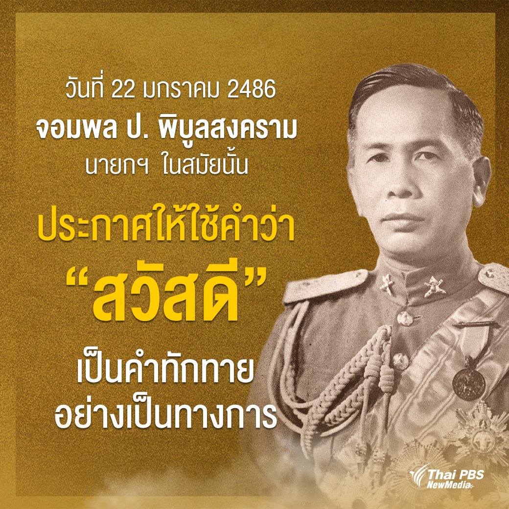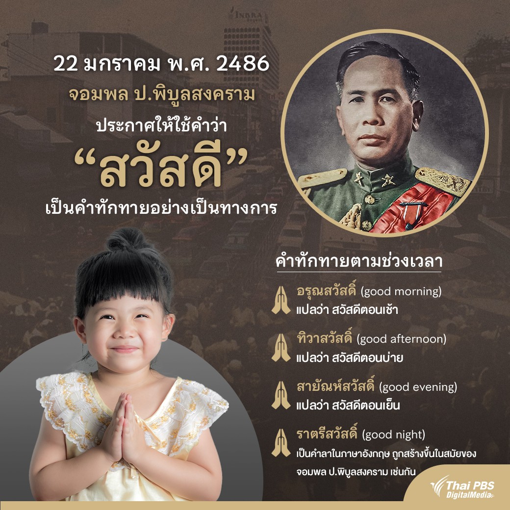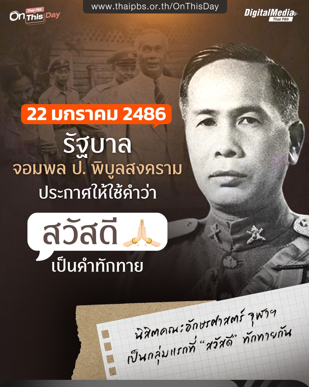 #วันนี้ในอดีต 22 มกราคม 2486 รัฐบาลจอมพล ป. พิบูลสงคราม ประกาศให้ใช้คำว่า #สวัสดี เป็นคำทักทาย