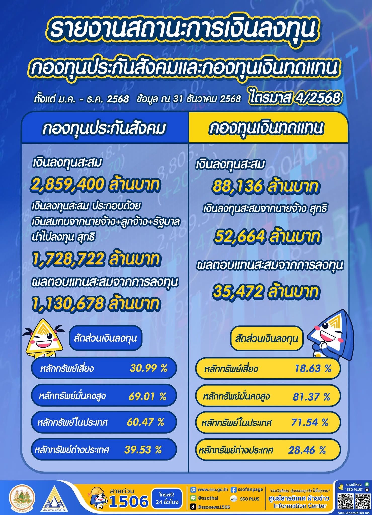 “จากรายงาน ณ สิ้นปี 2568 นี้ เป็นเครื่องยืนยันว่ากองทุนที่สำนักงานประกันสังคมดูแลอยู่มีเสถียรภาพสูง ดำเนินการตามขั้นตอน ระเบียบ/ประกาศ ที่เกี่ยวข้องอย่างครบถ้วนและรัดกุม เป็นไปตามมาตรฐานสากล และมุ่งเน้น